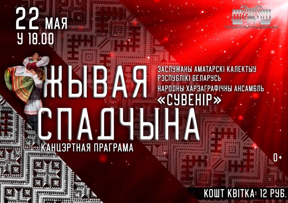 Дворец культуры области приглашает 22 мая в 18.00 на концертную программу «Жывая спадчына» заслуженного любительского коллектива Республики Беларусь народного хореографического ансамбля «Сувенир».