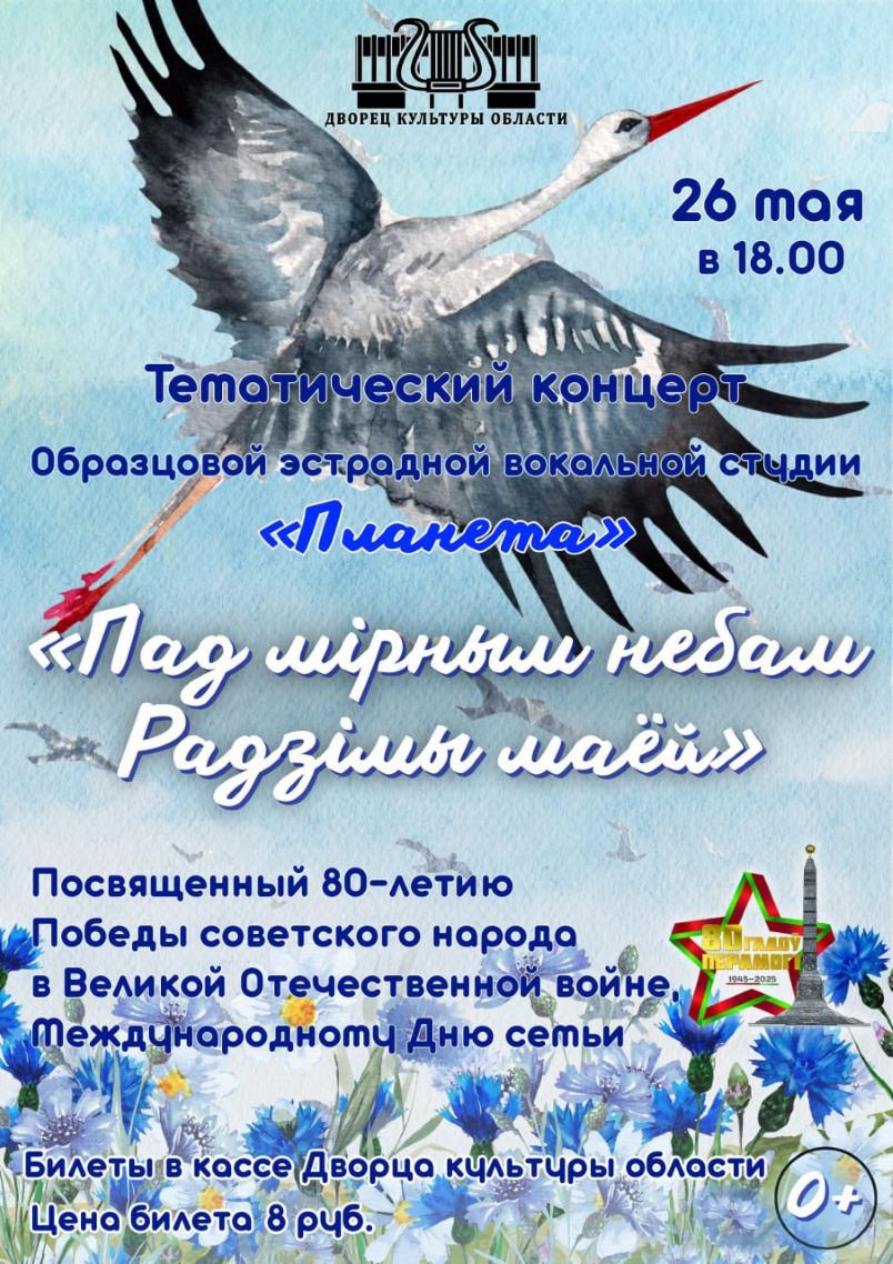 26 мая 2025 года в 18.00 Дворец культуры области приглашает на тематический концерт «Пад мірным небам Радзімы маей» образцовой эстрадной вокальной студии «Планета», посвященный 80-летию Победы советского народа в Великой Отечественной войне и Международному Дню семьи. Концерт является завершающим мероприятием одноименного проекта студии «Планета», посвященного 80-й годовщине.