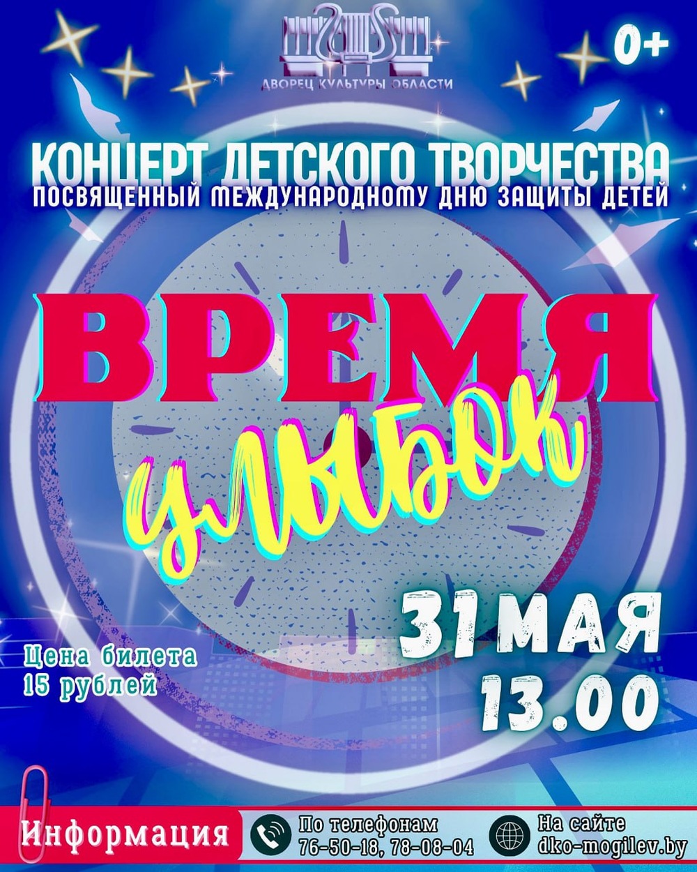 31 мая во Дворце культуры области состоится концерт детского творчества «Время улыбок». Участники посвящают свое творчество любимым родителям, и с нетерпением ждут встречи с гостями праздничного концерта!