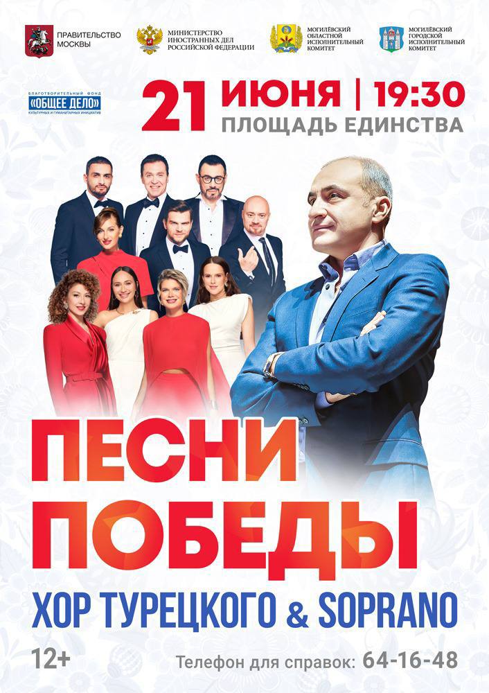 Концерт посвящен 80-летию Победы. Легендарный «Хор Турецкого» представит свою программу «Песни Победы» с песнями о мире, подвиге и любви – от «Бухенвальдского набата» до «Катюши» и «Смуглянки». Специальным подарком станет исполнение песен на белорусском языке!