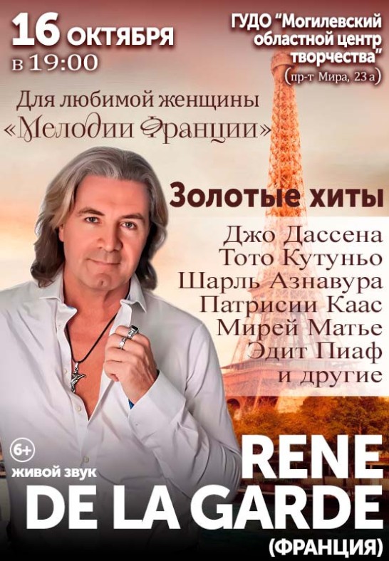 Французский певец, поэт и композитор Rene De La Garde с романтической программой «Мелодии Франции». Для Вас прозвучат всем известные золотые хиты Джо Дассена, Шарль Азнавура, Мирей Матье, Эдит Пиаф, Патрисии Каас и других мировых звёзд в виртуозном исполнении Rene De La Garde.