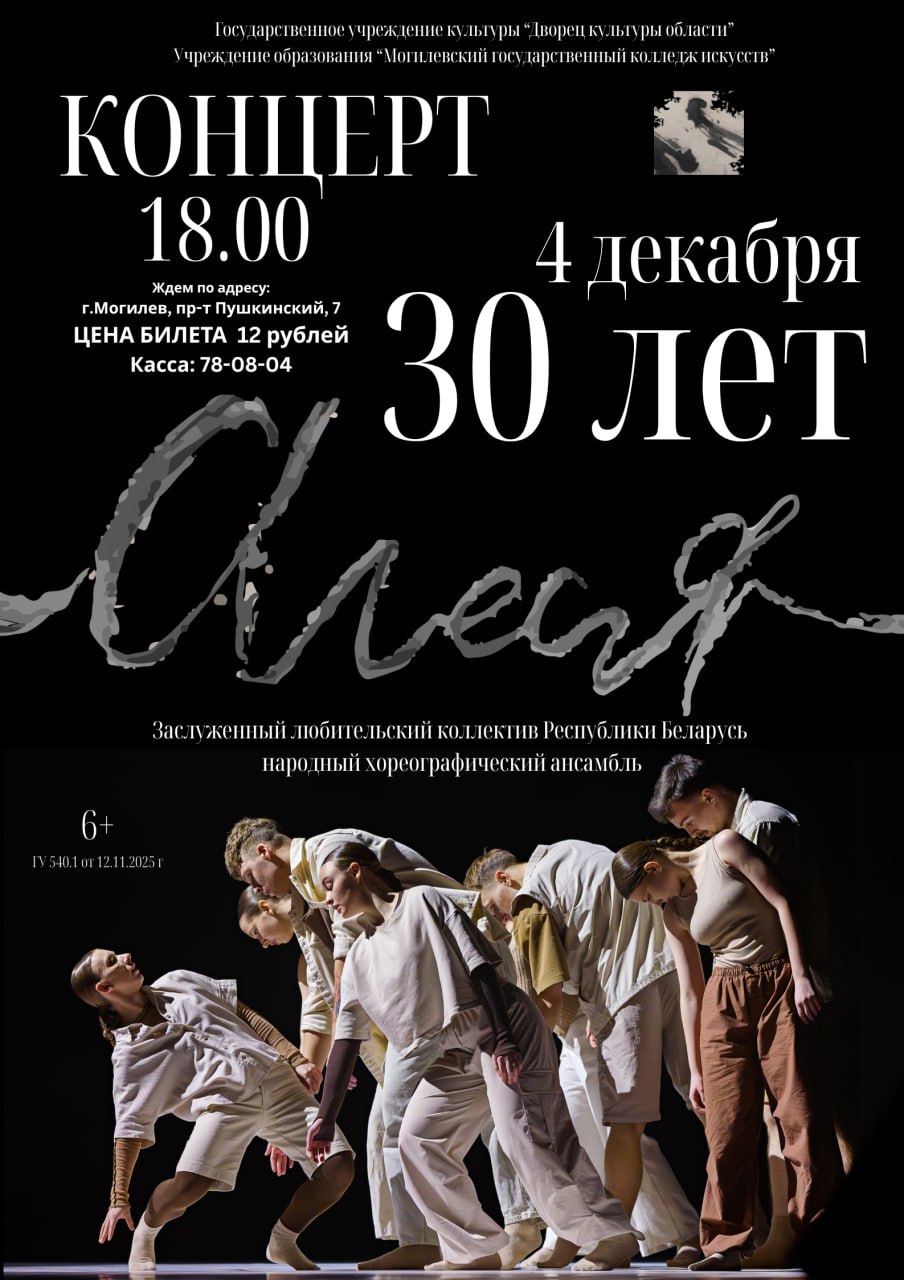 Концерт, посвященный 30-летию ансамбля «Алеся», состоится 4 декабря в 18.00 во Дворце культуры области. В программе — лучшие и любимые номера, а также работы, принимавшие участие в престижных международных и республиканских конкурсах.