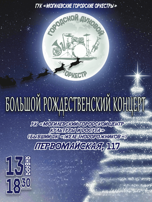 ГУК "Могилевские городские оркестры" приглашает Вас 13 января 2026 г. в 18.30 в филиал Городского центра культуры по адресу Первомайская,117, где состоится Большой рождественский концерт оркестра духовых инструментов под управлением Александра Городкова.