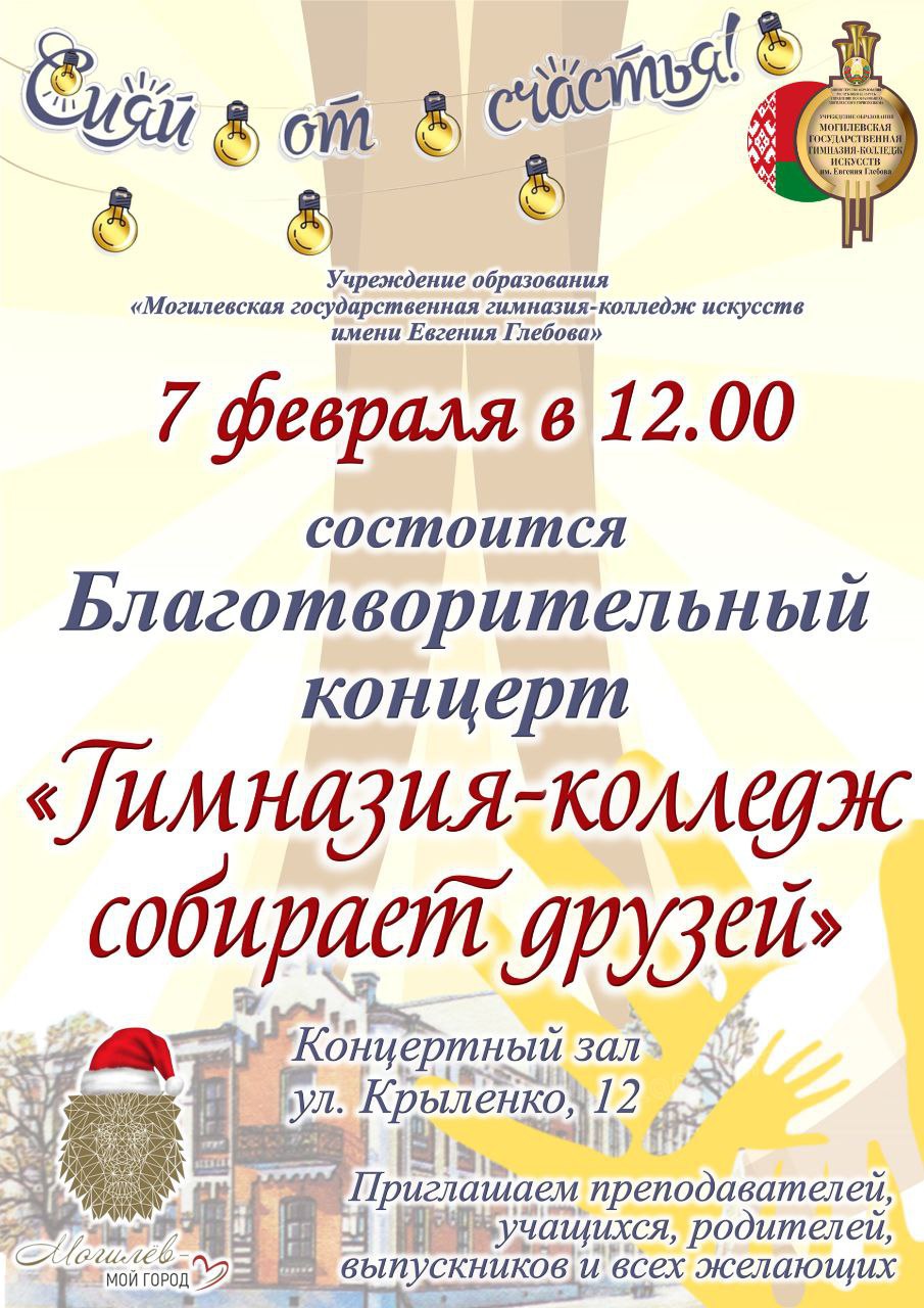 «Могилевская государственная гимназия-колледж искусств имени Евгения Глебова» приглашает 7 февраля в 12.00 на благотворительный бесплатный концерт «Гимназия-колледж собирает друзей», который состоится в концертном зале учебного заведения по адресу: Могилев, ул. Крыленко, 12.