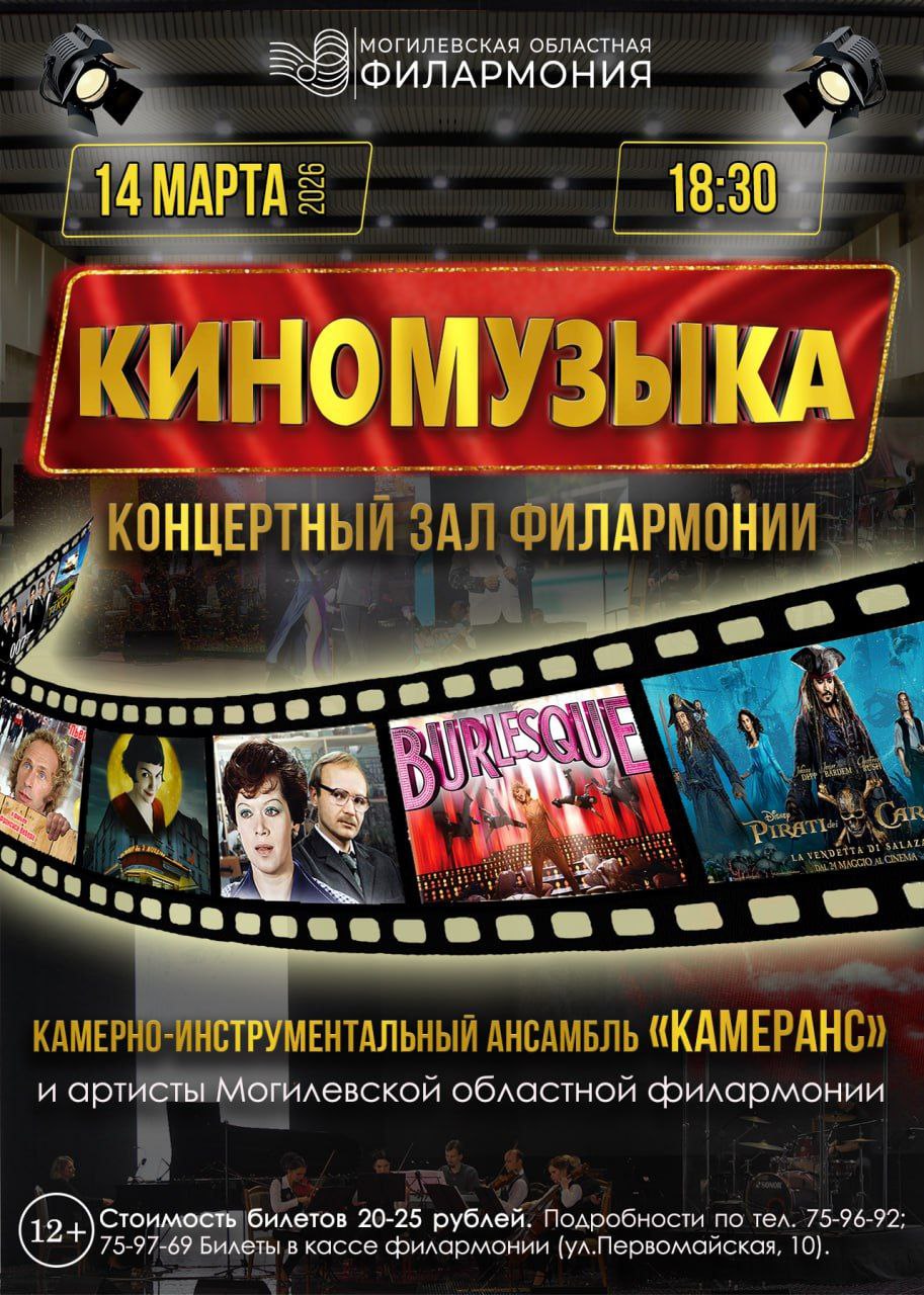 Для Вас прозвучат популярные мелодии отечественного и зарубежного кинематографа в исполнении камерно-инструментального ансамбля «КамерАнс» и солистов Могилевской областной филармонии. Вашему вниманию будут представлены композиции из таких фильмов как «1+1», «Пираты Карибского моря», «Джеймс Бонд», «Бриллиантовая рука», «Служебный роман» и др.