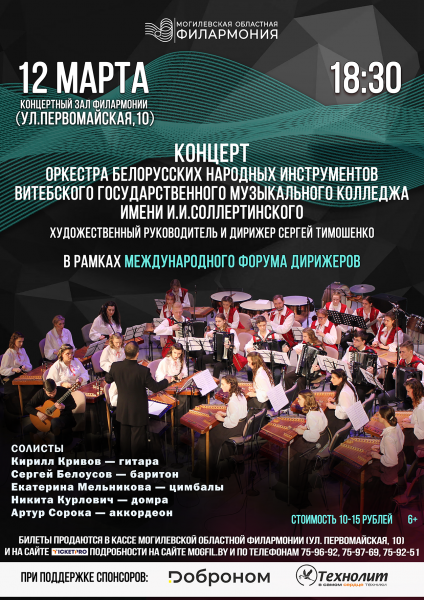 В рамках международного форума дирижеров 12 марта в 18.30 в концертном зале филармонии состоится концертное выступление обладателя Гран-при конкурса имени Л.Л. Иванова (2024) оркестра белорусских народных инструментов Витебского государственного музыкального колледжа имени И.И.Соллертинского (художественный руководитель и дирижер Сергей Тимошенко).