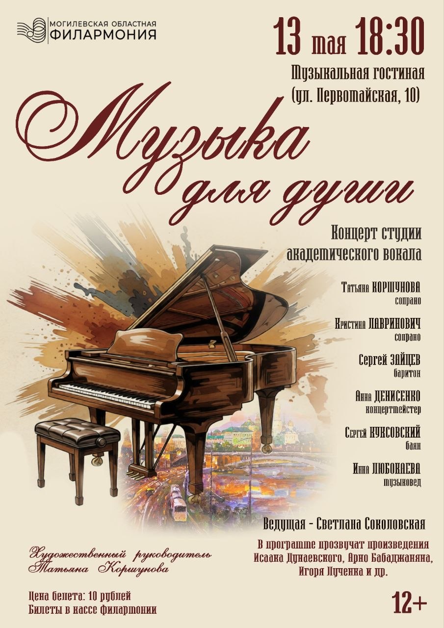 В музыкальной гостиной Могилевской областной филармонии пройдет концертная программа «Музыка для души» студии академического вокала (художественный руководитель — Татьяна Коршунова), ведущая — Светлана Соколовская. В концерте прозвучат любимые песни из советских кинофильмов и лучшие хиты прошлых лет на музыку Исаака Дунаевского, Арно Бабаджаняна, Игоря Лученка и других известных композиторов в сопровождении фортепиано и баяна. В программе возможны изменения.