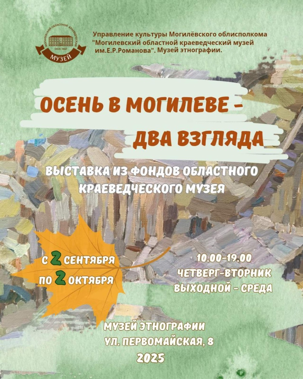На выставке «Осень в Могилеве – два взгляда» экспонируются картины белорусских и иностранных живописцев, принявших участие в первом Международном пленере проходившем осенью 1987 г. в Могилеве. Основными объектами художественных полотен молодых художников стали храмы и монастыри, природа Могилевщины, городская архитектура. На выставке представлено более 20-ти работ художников.
