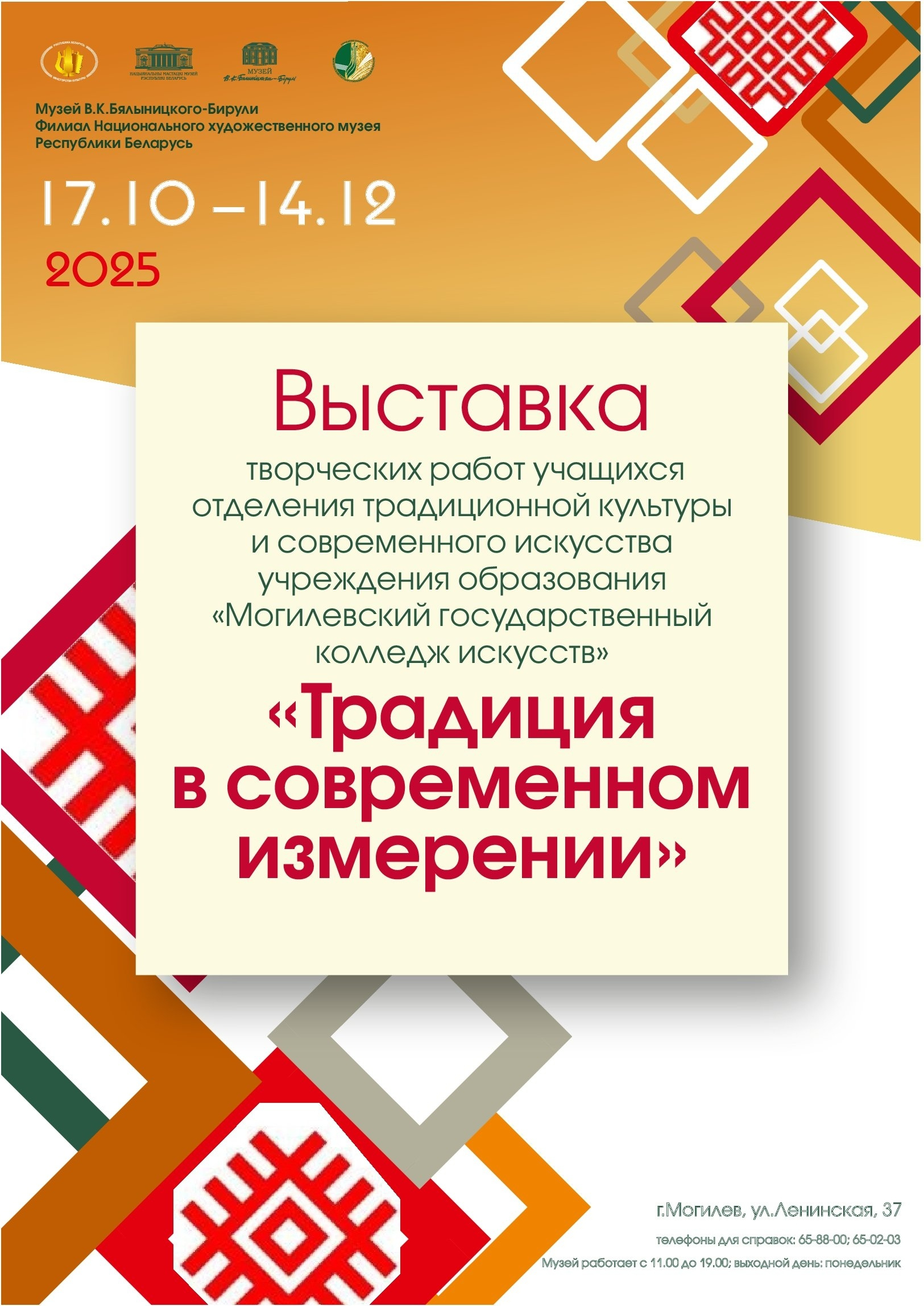 17 октября 2025 года в 16:00 в Музее В.К.Бялыницкого-Бирули состоится торжественное открытие выставки «Традиция в современном измерении» работ учащихся отделения традиционной культуры и современного искусства учреждения образования «Могилевский государственный колледж искусств».