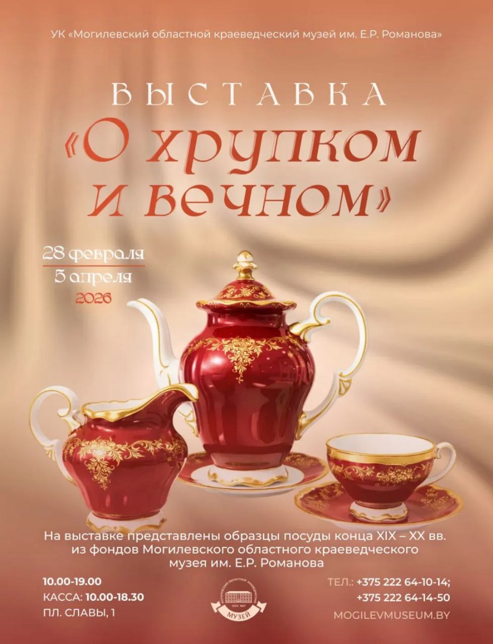 В Могилевском областном краеведческом музее им. Е. Р. Романова открылась выставка посуды «О хрупком и вечном». В экспозиции представлены образцы посуды конца XIX - XX веков из фондов музея — от утонченного фаянса до жаровых самоваров.