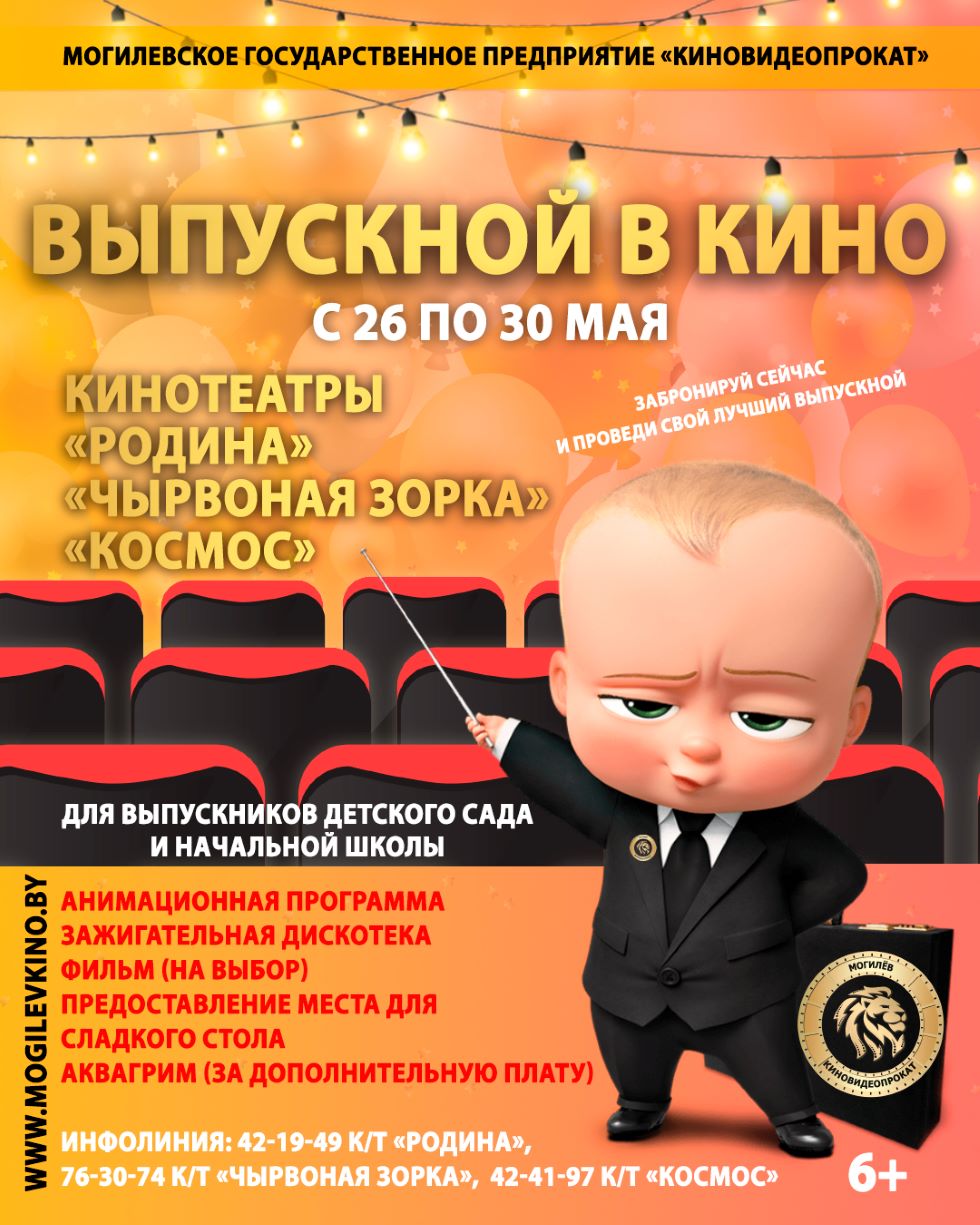 С 26 по 30 мая кинотеатры «Родина», «Чырвоная Зорка», «Космос» Могилевского государственного предприятия «Киновидеопрокат» приглашают выпускников детских садов, начальных классов и их родителей на «Выпускной в кино»!