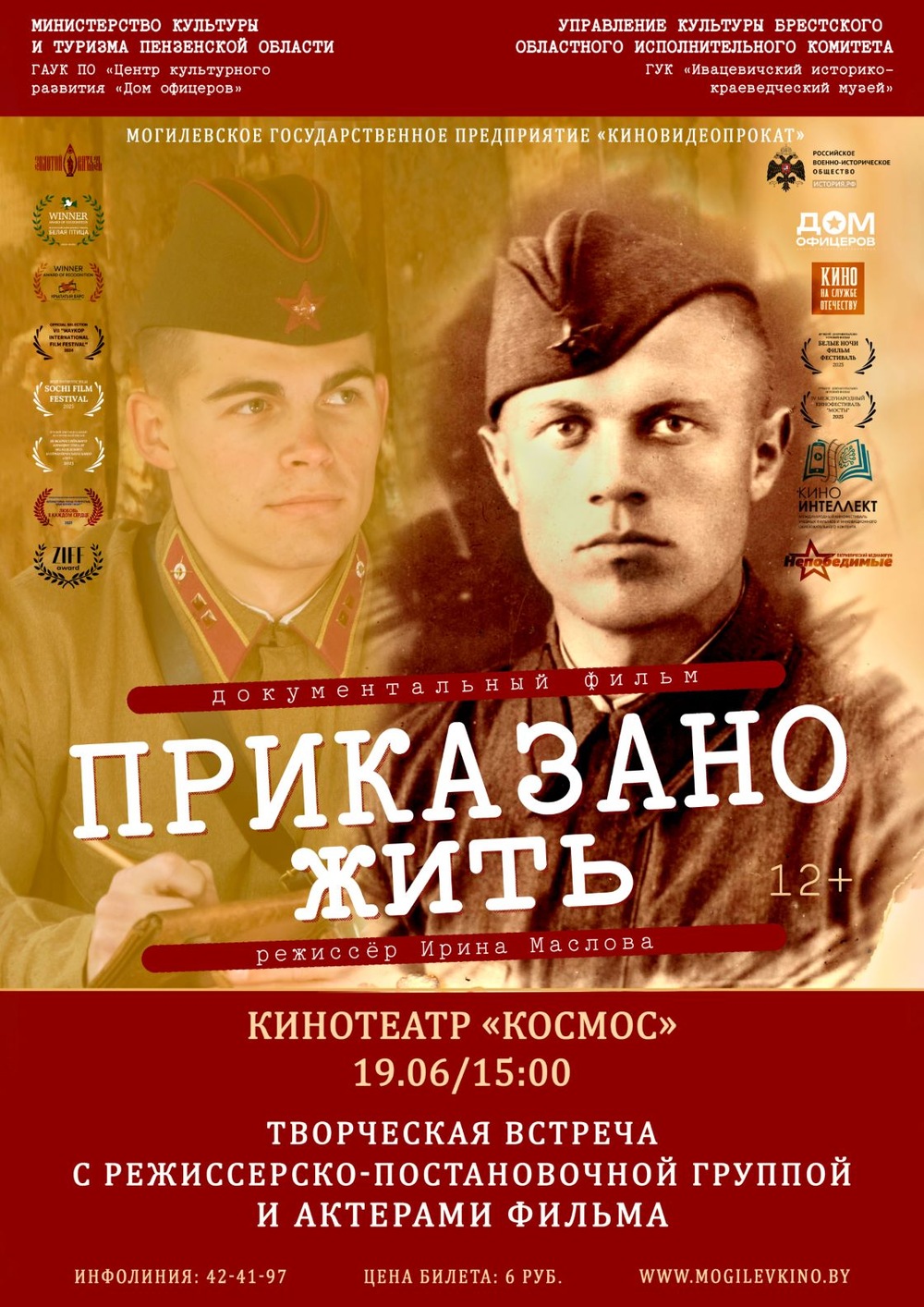 19 июня в 15:00 кинотеатр «Космос» Могилевского государственного предприятия «Киновидеопрокат» приглашает на творческую встречу с историком, профессором, режиссером документального фильма «Приказано жить» Ириной Масловой (Россия) и актерами – курсантами Пензенского артиллерийского инженерного института.