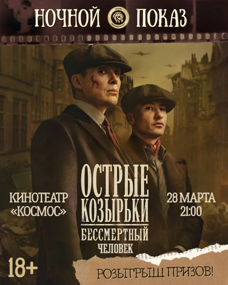 28 марта приглашаем в кинотеатр «Космос» на ночной показ фильма «Острые козырьки: Бессмертный человек». Вас ждёт захватывающий сюжет и розыгрыш призов.