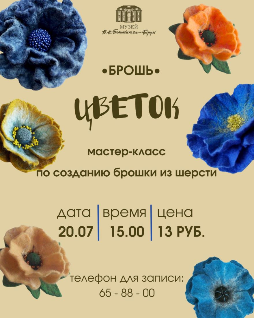 20 июля в 15:00 в филиале Национального художественного музея Республики Беларусь "Музей В.К. Бялыницкого-Бирули" состоится мастер-класс по мокрому валянию брошки из шерсти "Цветок"!
