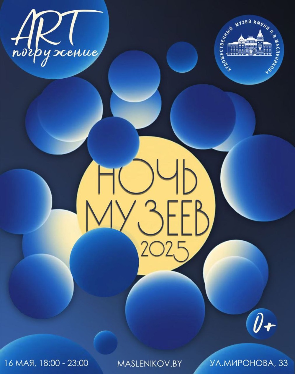 «Ночь музеев» — ежегодная акция, во время которой тысячи музеев по всему миру открывают свои двери для всех желающих насладиться искусством. Акция – событие, объединяющее музеи и позволяющее сделать искусство чуть ближе зрителю. В этом году она пройдет 16 мая в преддверии Международного дня музеев. Художественный музей имени П.В. Масленикова 16 мая 2025 года приглашает с 18.00 до 23.00 посетить интерактивное мероприятие «Арт-погружение». В эту ночь каждый гость погрузится в мир искусств, наполненный музыкой, танцами и яркими красками.