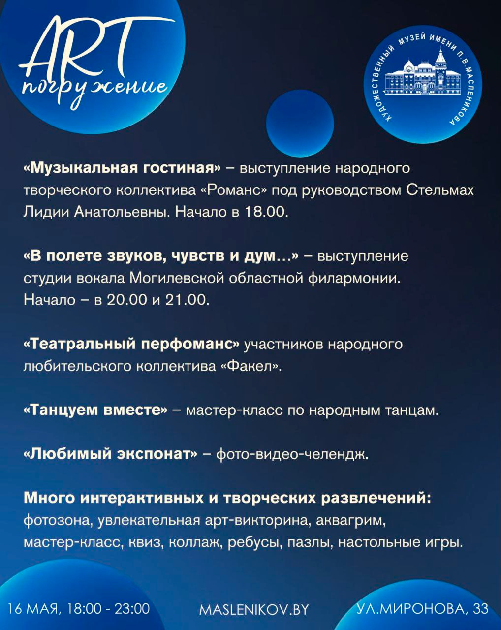 «Ночь музеев» — ежегодная акция, во время которой тысячи музеев по всему миру открывают свои двери для всех желающих насладиться искусством. Акция – событие, объединяющее музеи и позволяющее сделать искусство чуть ближе зрителю. В этом году она пройдет 16 мая в преддверии Международного дня музеев. Художественный музей имени П.В. Масленикова 16 мая 2025 года приглашает с 18.00 до 23.00 посетить интерактивное мероприятие «Арт-погружение». В эту ночь каждый гость погрузится в мир искусств, наполненный музыкой, танцами и яркими красками.