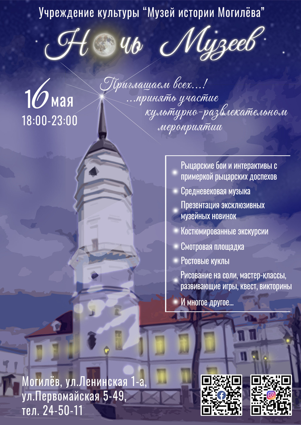 Ночь музеев проводится с 18:00 до 23:00. Начнутся мероприятия с рыцарских боев. Далее в программе — музыкальные номера, экскурсии по ратуше и подъем на башню (каждый час), презентация новых приобретений музея, просмотр советсткого фильма «Черный замок Ольшанский». Параллельно в выставочном зале Могилева на ул. Болдина (он является подразделением музея истории Могилева) будет своя Ночь с мастер-классами и другими активностями.