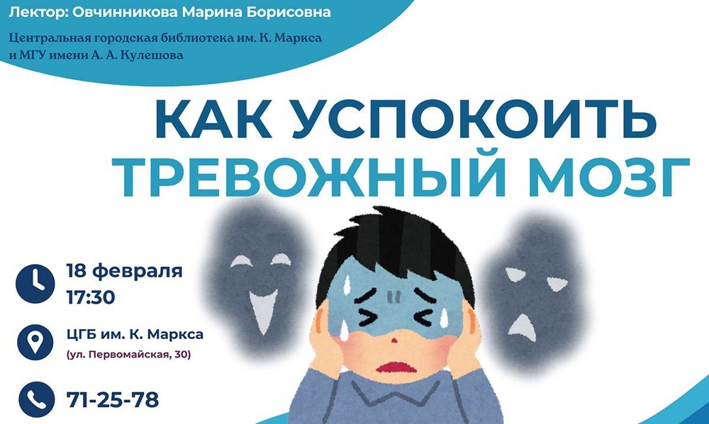 Открытый психологический лекторий на тему «Как успокоить тревожный мозг» пройдет в Центральной городской библиотеки им.К.Маркса (ул.Первомайская, 30).
