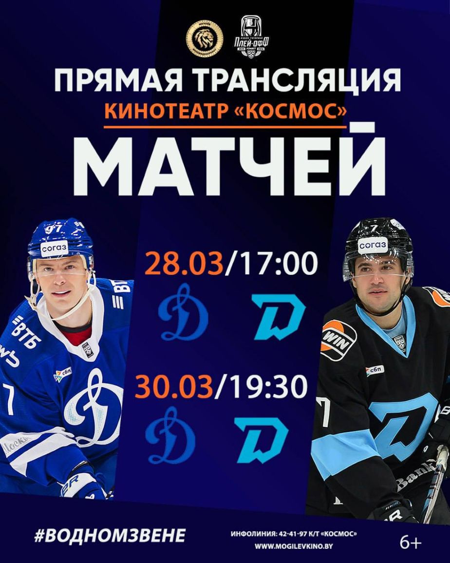 Кинотеатр «Космос» приглашает всех болельщиков на прямую трансляцию третьего и четвертого матчей между минским и московским «Динамо»!