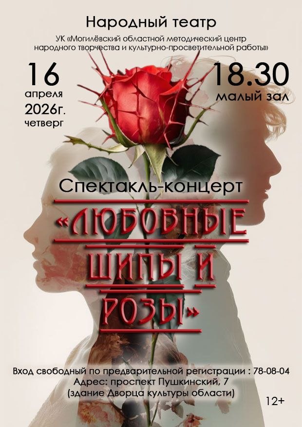 Народный театр УК «Могилёвский областной методический центр народного творчества и культурно-просветительной работы» приглашает на спектакль-концерт «Любовные шипы и розы», который состоится в малом зале ДК.