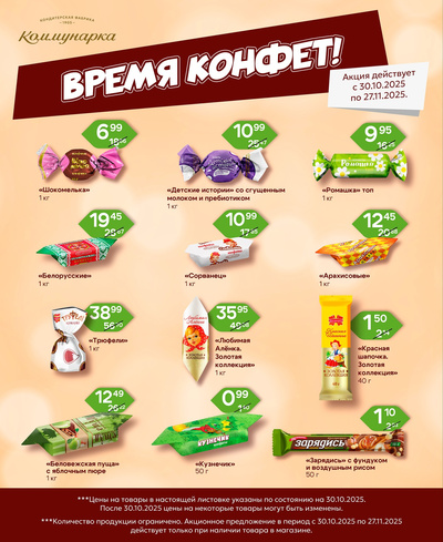 Кондитерская фабрика «Коммунарка» в ноябре зарядила скидки на очередную партию своей продукции. В фирменных магазинах фабрики, а в Могилеве он всего один, до 27 ноября можно купить конфета «Любимая Аленка» из золотой коллекции по 35,95 руб. за кг. Молочный шоколад с арахисовой пастой в…
