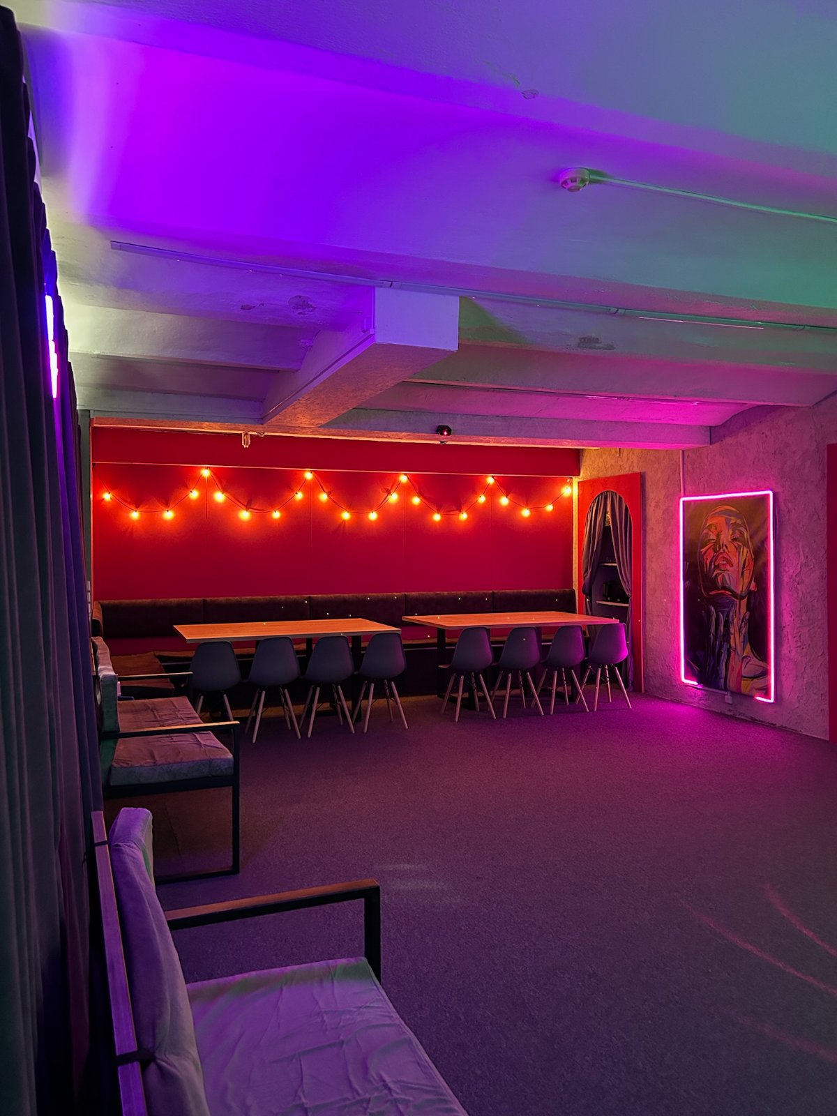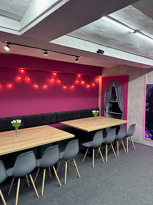 Зал Neon – уютный и атмосферный, вмещающий до 22 человек. Подходит для проведения мероприятий разных форматов. К вашим услугам огромный 4-х метровый экран, караоке, PlayStation, профессиональное музыкальное и световое оборудование, очки виртуальной реальности, разнообразные настольные игры и гигантская Дженга. Можно принести свои блюда и напитки, заказать доставку еды или воспользоваться услугами кейтеринга. Также можно задекорировать зал и сделать праздничную сервировку. Для вашего комфорта имеется холодильник, чайник, микроволновая печь.