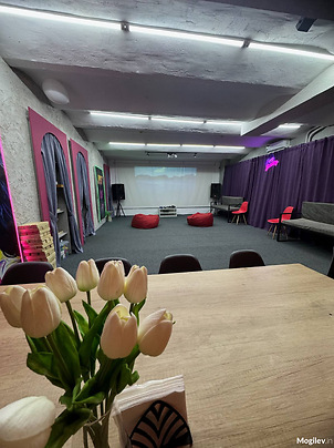 Зал LOFT – вмещает 22 человека. Имеется обеденная зона, проектор, караоке, настольные игры, очки виртуальной реальности, PlayStation. Можно принести свою еду и напитки.