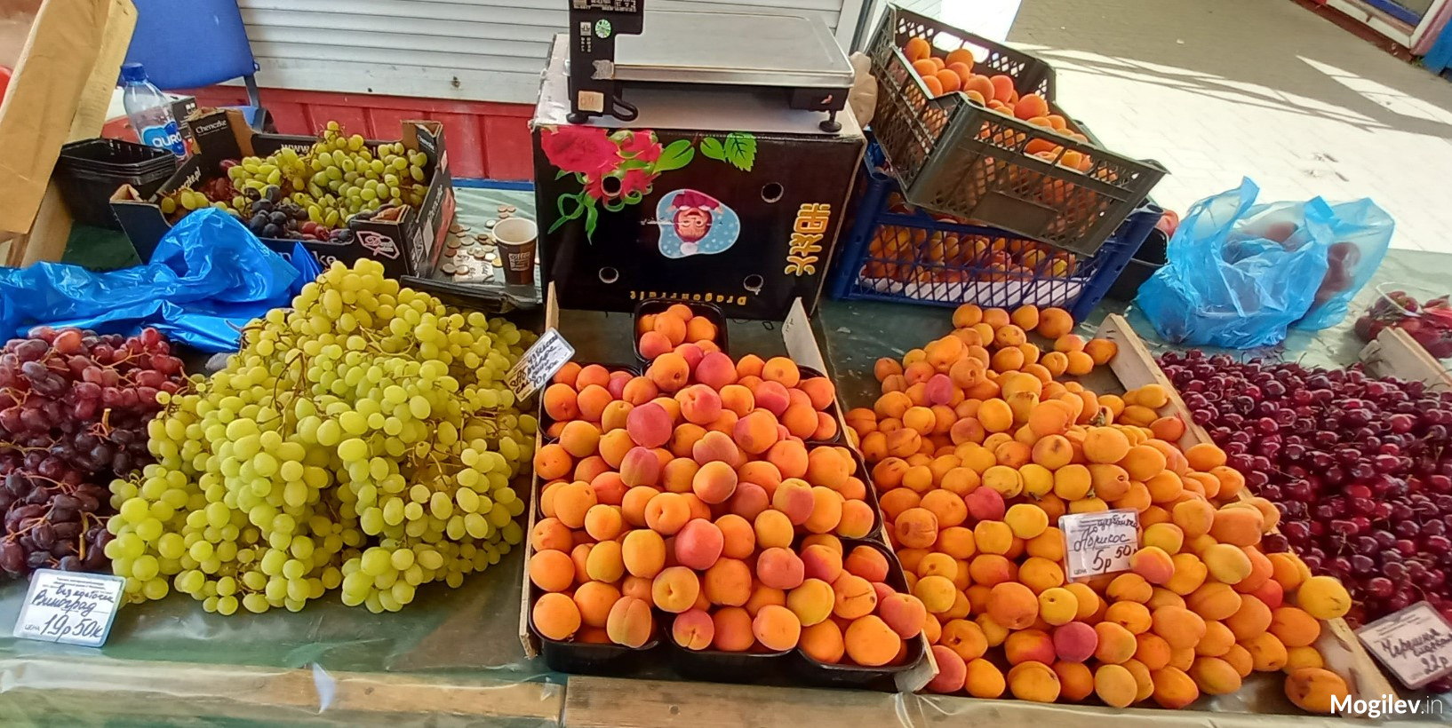 Клубники полно. Продавцы говорят, что есть брестская и греческая. Цена одинаковая. С виду тоже. Народ — на рынке толкотня — берет в основном пакетики на пробу по полкило. То там, то там очереди по несколько человек. Обычная цена клубники — 15 руб. за кг. Но есть по 17.80. Черешня 22-25 руб. /кг, абрикосы по 11-15 руб., те, что катастрофически быстро теряют внешний вид, отдают по пятерке. Голубику продают по 80 руб. Она сейчас — ценная королева рынка.