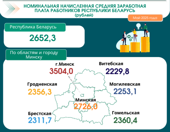 Номинальная начисленная средняя заработная плата работников (это «грязными» — до вычета налогов и взносов) в мае составила 2652,3 рубля, что на 38,8 рубля выше апрельской. Рост отмечен во всех областях, кроме Гродненской. В Минске средняя зарплата перевалила за 3,5 тысячи.