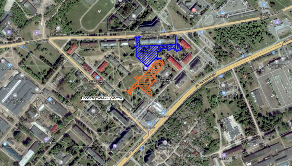 На севере от проектируемых участков располагаются жилые 3-этажки и улица Вишневецкого, севернее и западнее — многоквартирная жилая застройка, юго-восточнее располагаются жилая застройка, ЦТП, пункт приема вторсырья и социально-педагогический центр Октябрьского района Могилева.