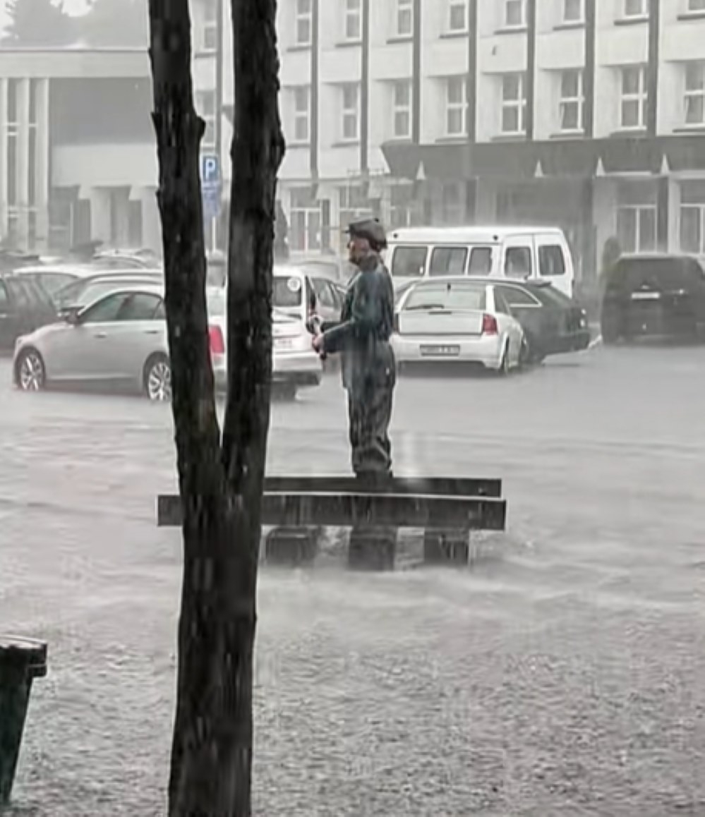 В Барановичах прошел ливень. Видео плывущей по улицам города скульптуры железнодорожника покорило соцсети.