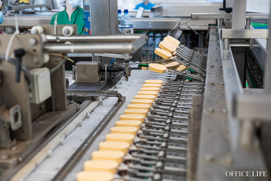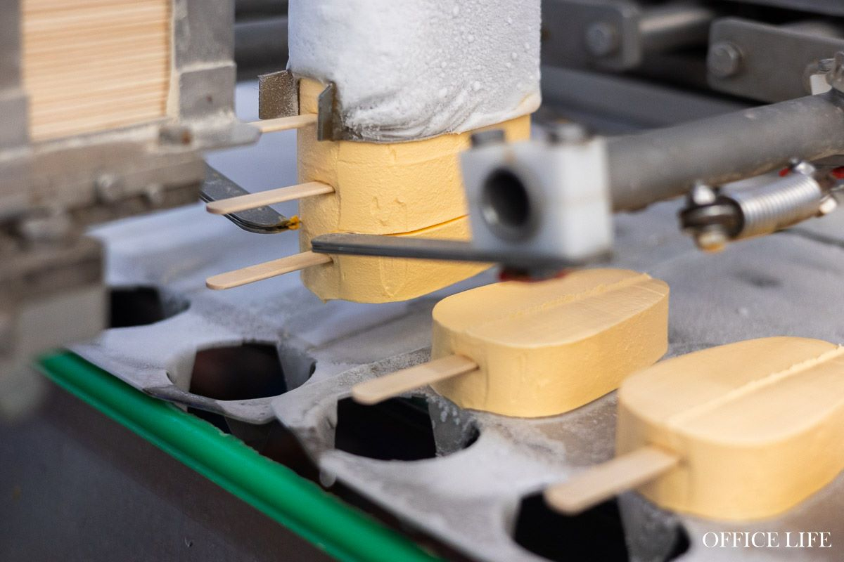 В остальном десерт делают из обычного белорусского сырья, и процесс выпуска такой же, как и у других видов мороженого. Сначала молоко разогревают до 40°С, затем добавляют другие компоненты — сахар, стабилизатор, масло, сухое и сгущенное молоко — и отправляют на температурную обработку. Затем готовую смесь охлаждают до 4°С и направляют на 10-часовое созревание, а потом — на фрезерование. Здесь будущий пломбир замораживают и насыщают кислородом. На линию мороженое выходит при минус 4°С. Именно здесь лакомство приобретает форму эскимо и закаливается 25 минут при температуре минус 38°С в морозильной камере. При необходимости пломбир могут выпускать в стаканчике или рожке. Кроме того, на участке уже начали выпускать сырное мороженое в весовом виде — по 400 г, это позволяет отправлять больше продукта в торговые сети.