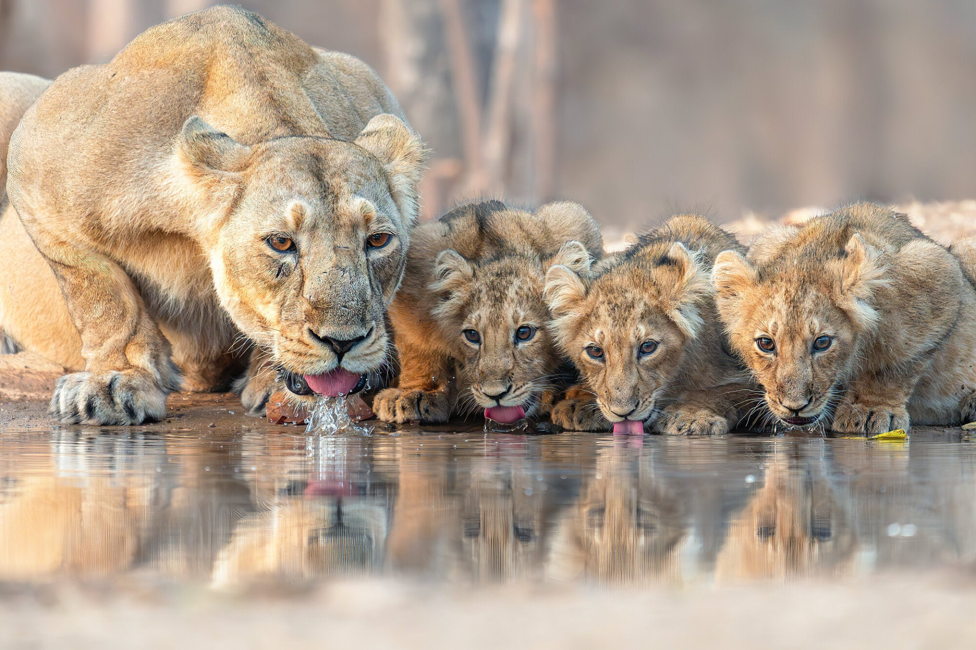 Фото снято в национальном парке Гир в Индии — последнем оплоте азиатских львов. Эти неуловимые львы с их сероватой шерстью практически сливаются с окружающей средой, в отличие от своих африканских сородичей, чей желтовато-коричневый окрас подходит для открытых саванн. Мама привела детенышей на водопой.