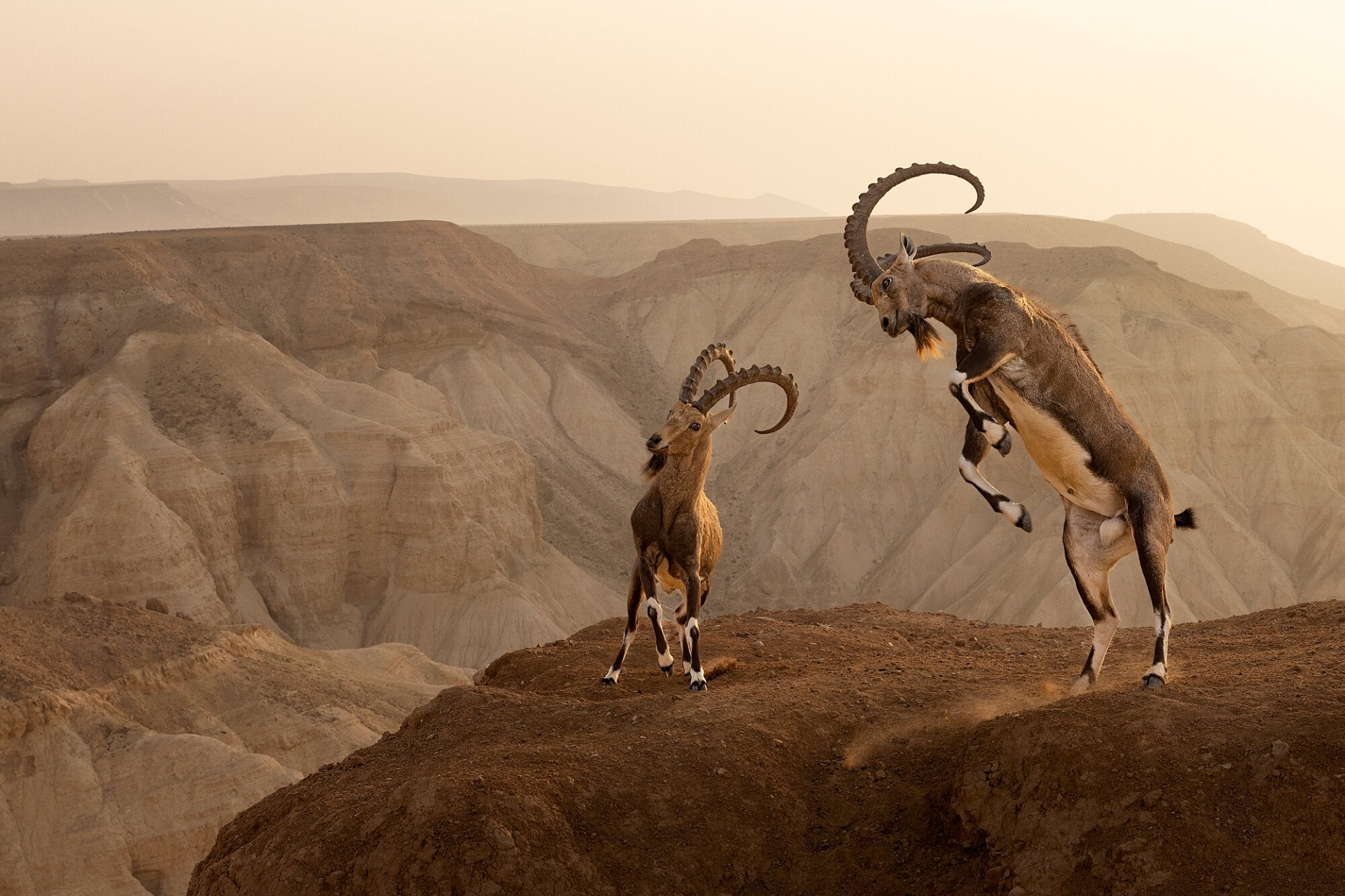 Снимок из Израиля. Два дерущихся нубийских горных козла на фоне впечатляющего пейзажа. Битва длилась около 15 минут, после чего один самец сдался, и пара разошлась без серьёзных травм. В преддверии брачного сезона у самцов утолщаются шейные мышцы, а часть шерсти темнеет. Соперники сначала оценивают друг друга, затем встают на задние лапы и сталкиваются головами. В некоторых случаях удар может быть настолько сильным, что при столкновении ломаются рога.