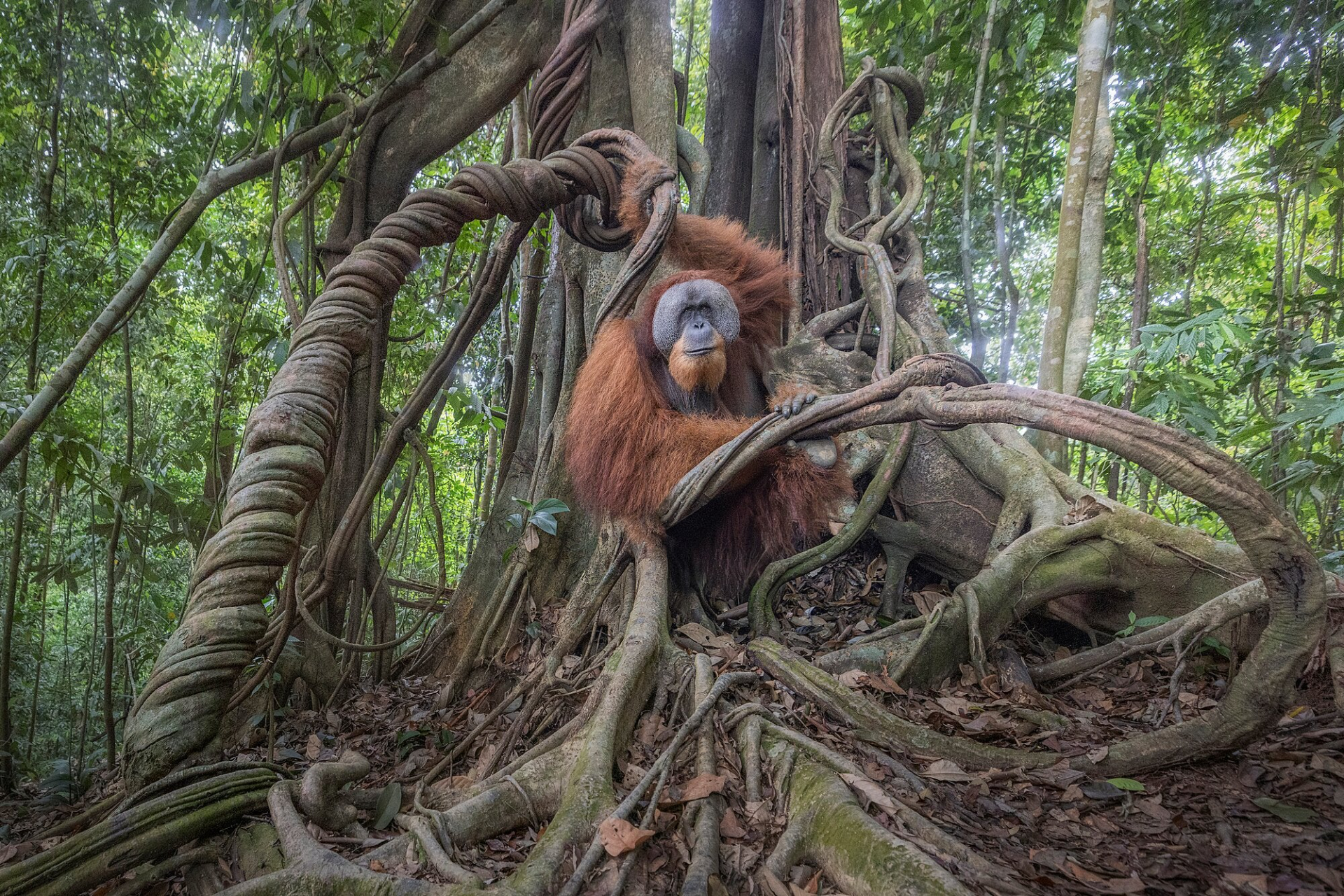 Фото сделано на острове Северная Суматра, Индонезия. Дикий самец суматранского орангутанга позирует на фикусе-душителе.