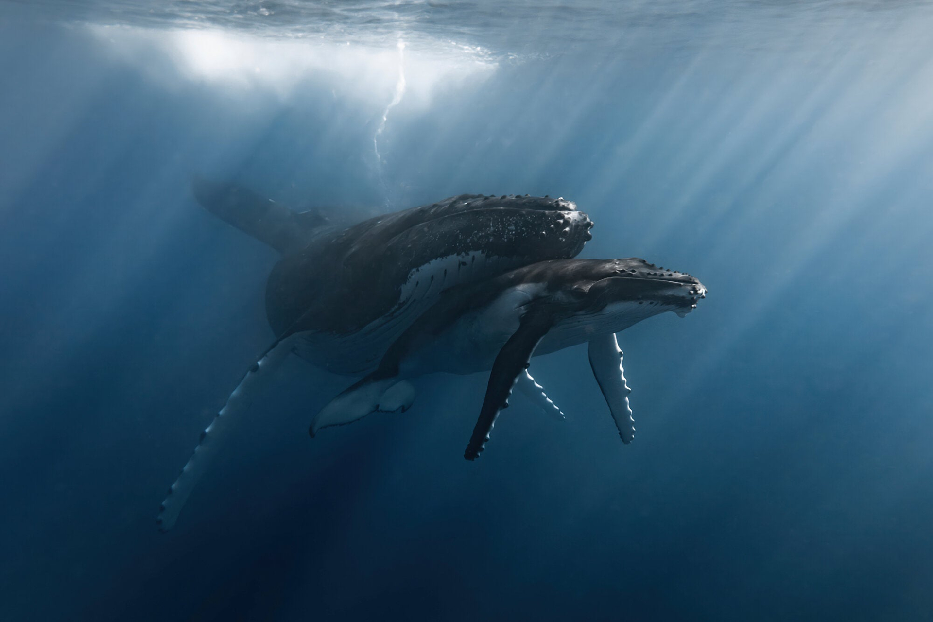 Фото из Муреа, Французская Полинезия. Горбатые киты мать и детеныш на прогулке. Они отдыхали на поверхности, когда детёныш прижался к матери. В этом возрасте юные киты плохо контролируют свою плавучесть и часто используют своих матерей в качестве утяжелителей, чтобы не всплывать на поверхность.