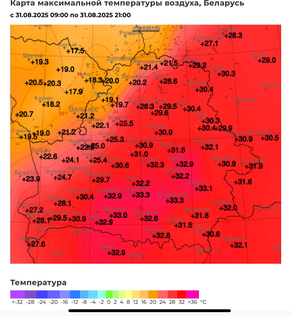 В последние дни в стране установилась сухая погода, а финал последней недели августа и вовсе отметился рекордной жарой, которой не было в Беларуси в течение лета. 30 и 31 августа в Могилеве термометры перешагнули отметку +30. Максимальных значений в областном центре температура достигла 31 августа — плюс 32,1.