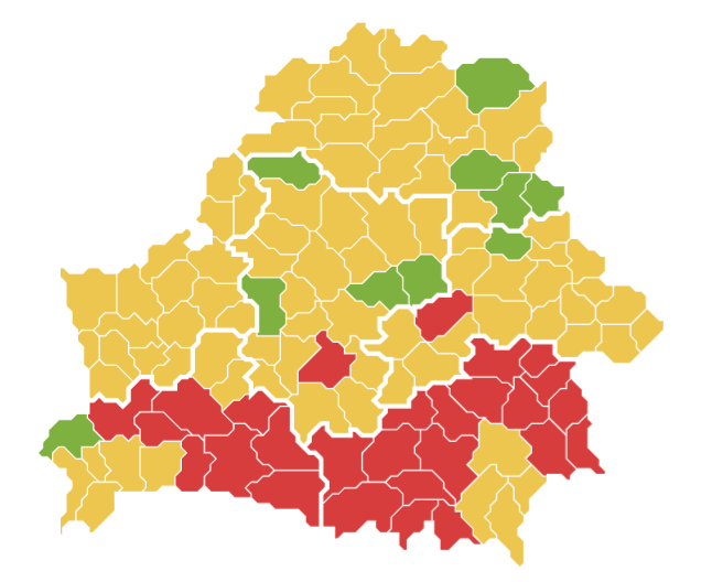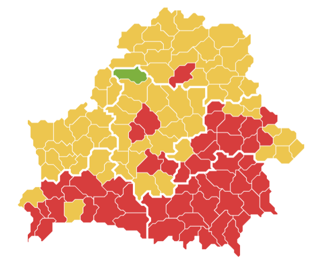 Если введен режим ограничения, то, как правило, он запрещает въезжать в лес на транспорте, разводить там костры и проводить работы, не связанные с ведением лесного хозяйства. Каждым райисполкомом конкретные ограничительные меры устанавливаются самостоятельно. Например, в Могилевском районе при III классе пожарной опасности — желтый уровень — в лесах ограничено нахождение граждан, в решении Быховского исполкома упоминаются только ограничения для въезда машин. Решения райисполкомов прикреплены на интерактивной карте Минлесхоза. Чтобы их просмотреть, нужно кликнуть на границы конкретного района.