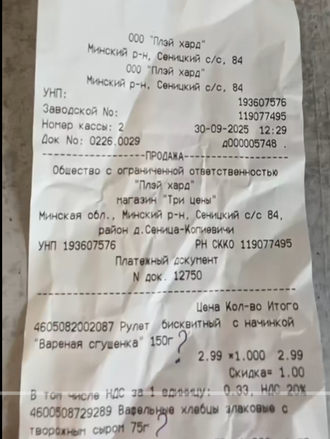 Минчанка, вернувшись домой из магазина «Три цены», обнаружила в чеке пару товаров, которые она не покупала. Счет шел на 4 рубля, но девушка вернулась в магазин «из принципа» за деньгами, хотя, как она призналась в ролике, который выложила в Тикток, поездка в магазин ей обошлась дороже.