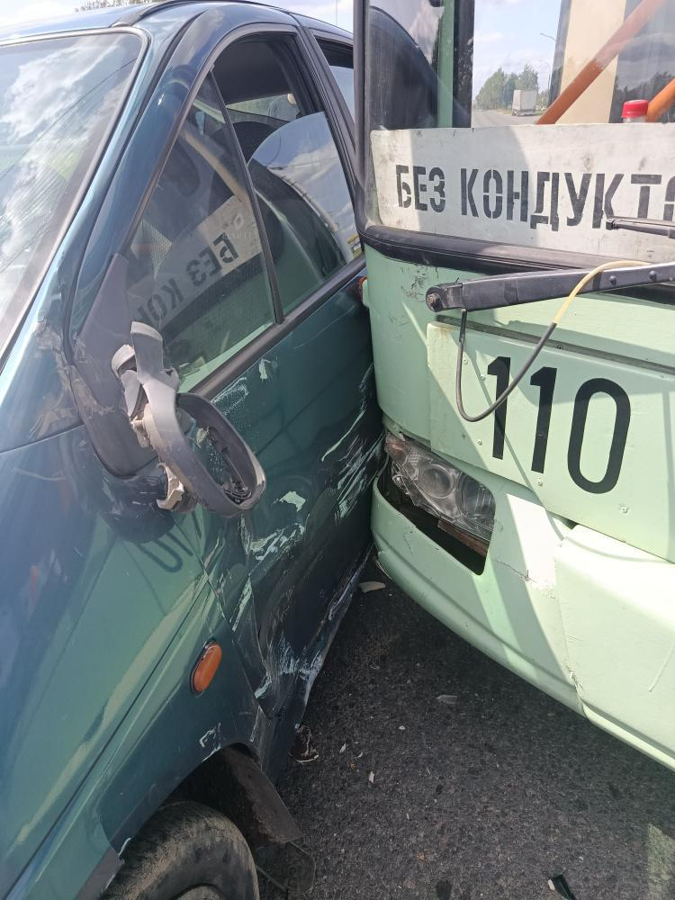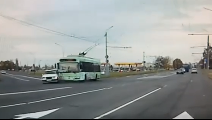 Легковушка, выезжая на главную дорогу, не пропустила троллейбус и буквально перекрыла ему проезд. После столкновения троллейбус протянул автомобиль на некоторое расстояние.