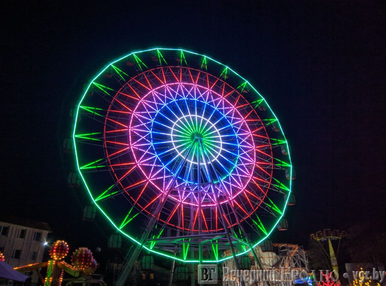 Обновленное колесо обозрения в Гродно стало новой туристической фишкой и звездой соцсетей. Несколько дней назад на аттракционе заменили подсветку.