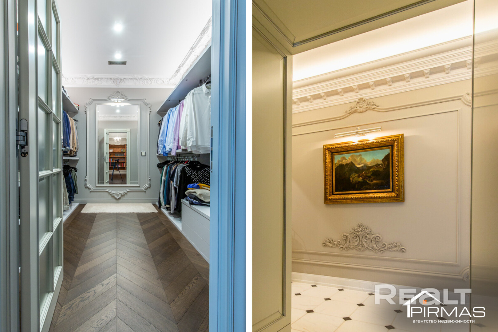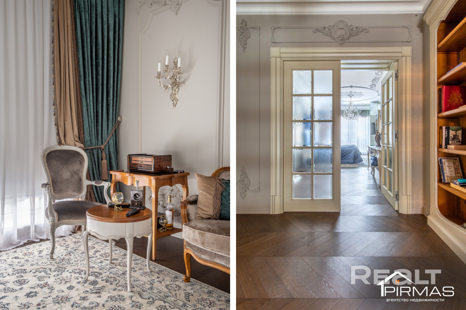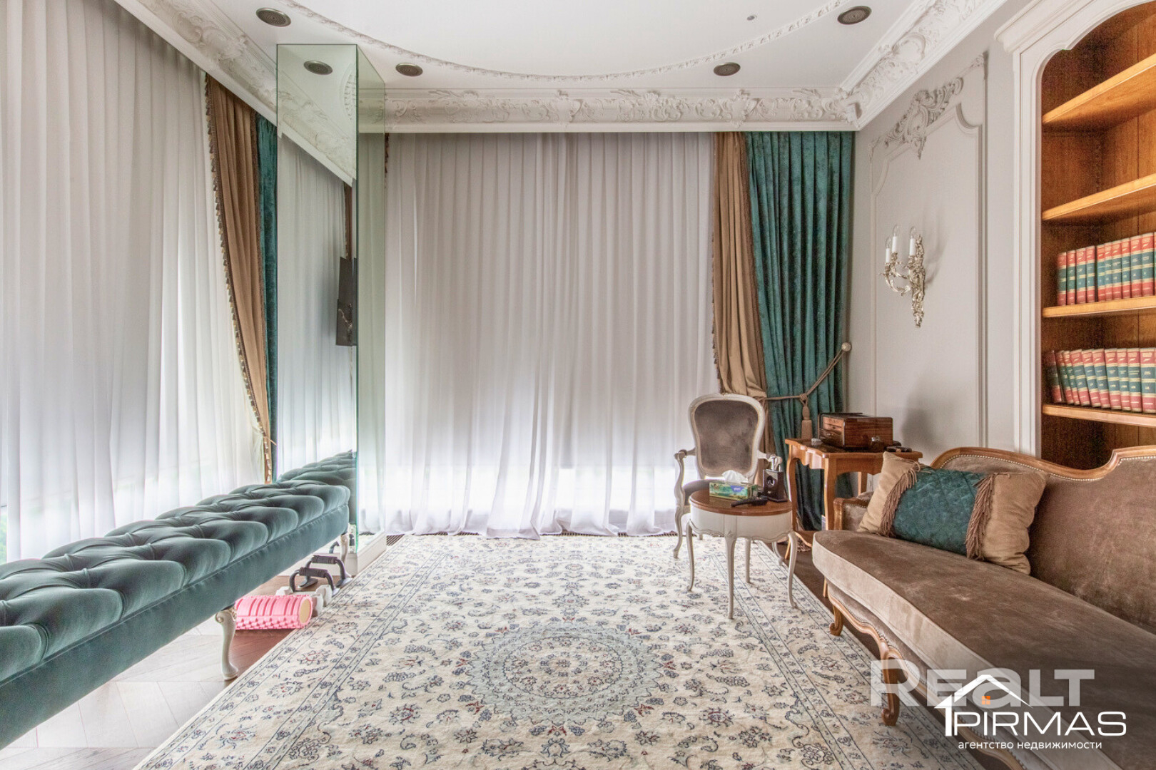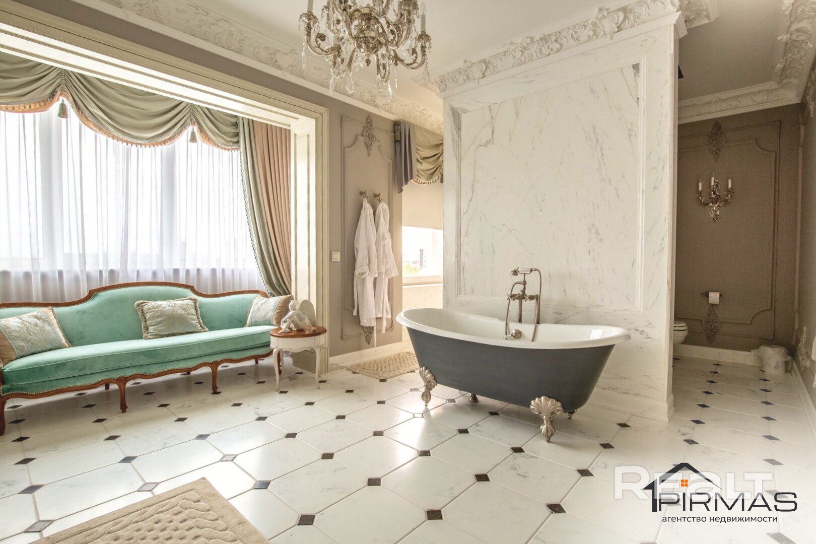 В квартире огромный холл, гостиная, объединённая со столовой зоной и собственным камином, отдельная кухня, основная спальня с гардеробной и ванной с окном, гостевая спальня с гардеробной, санузлом с душем, кабинет с библиотекой, постирочная с выдвижной кроватью для персонала, а еще — отдельные хозяйственные и технические помещения.