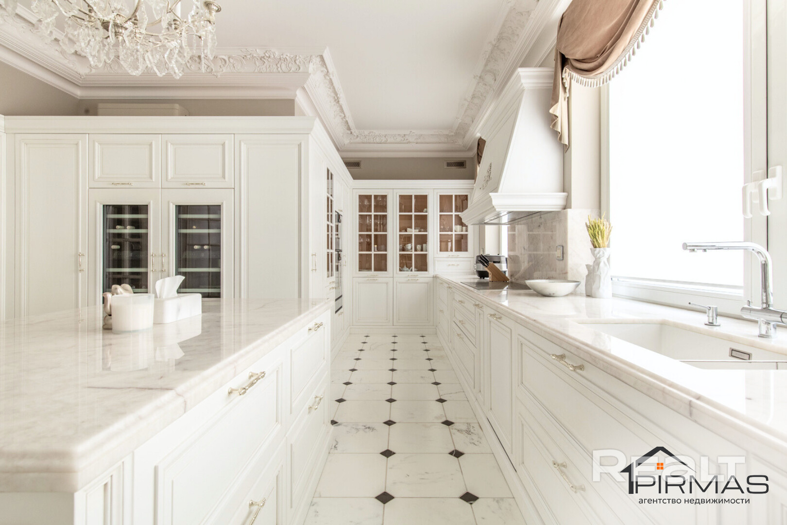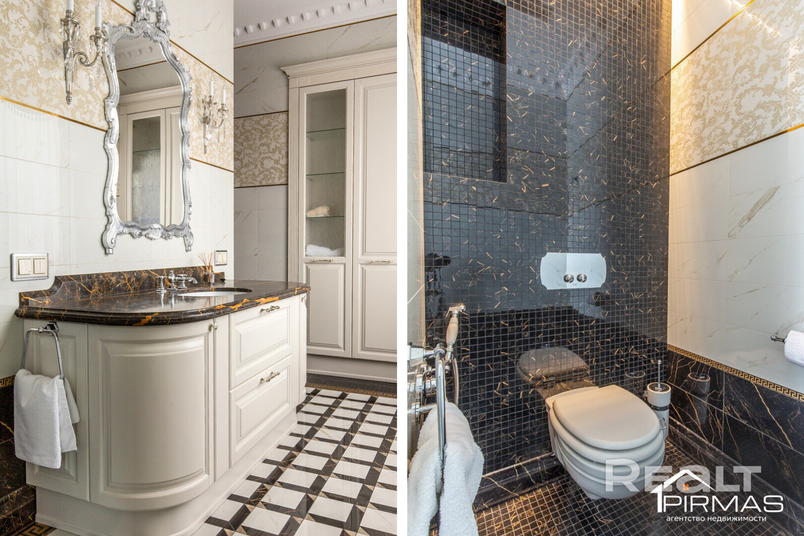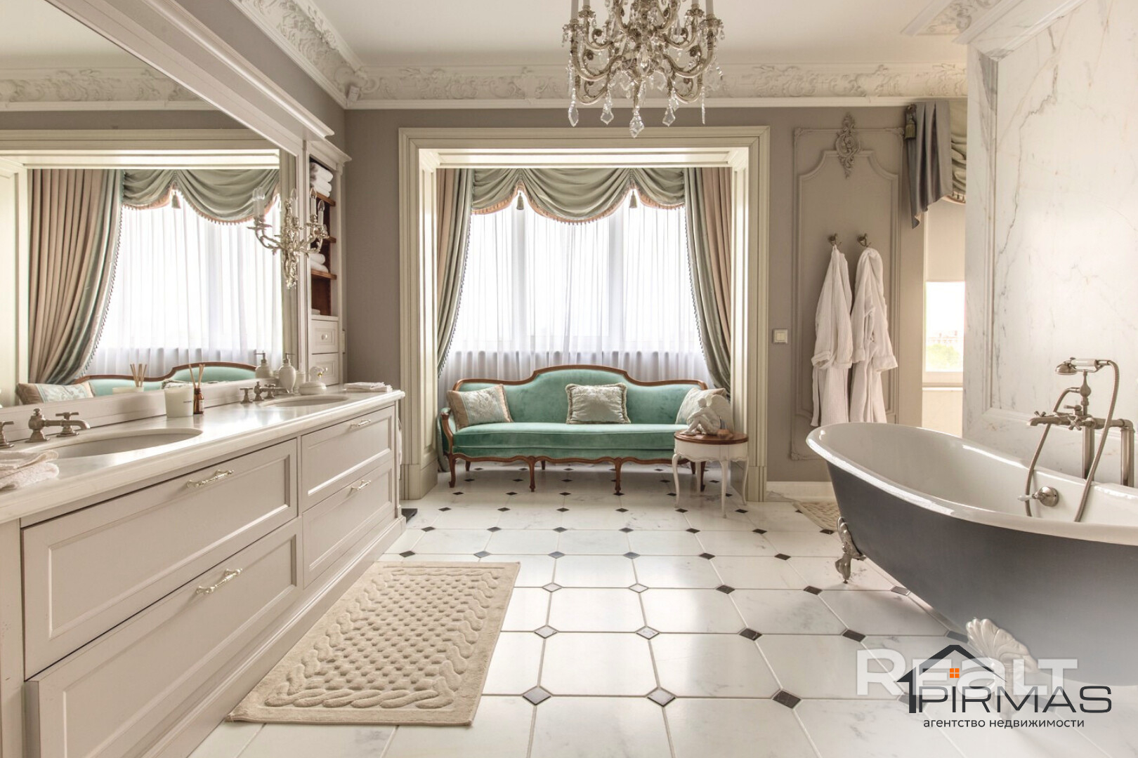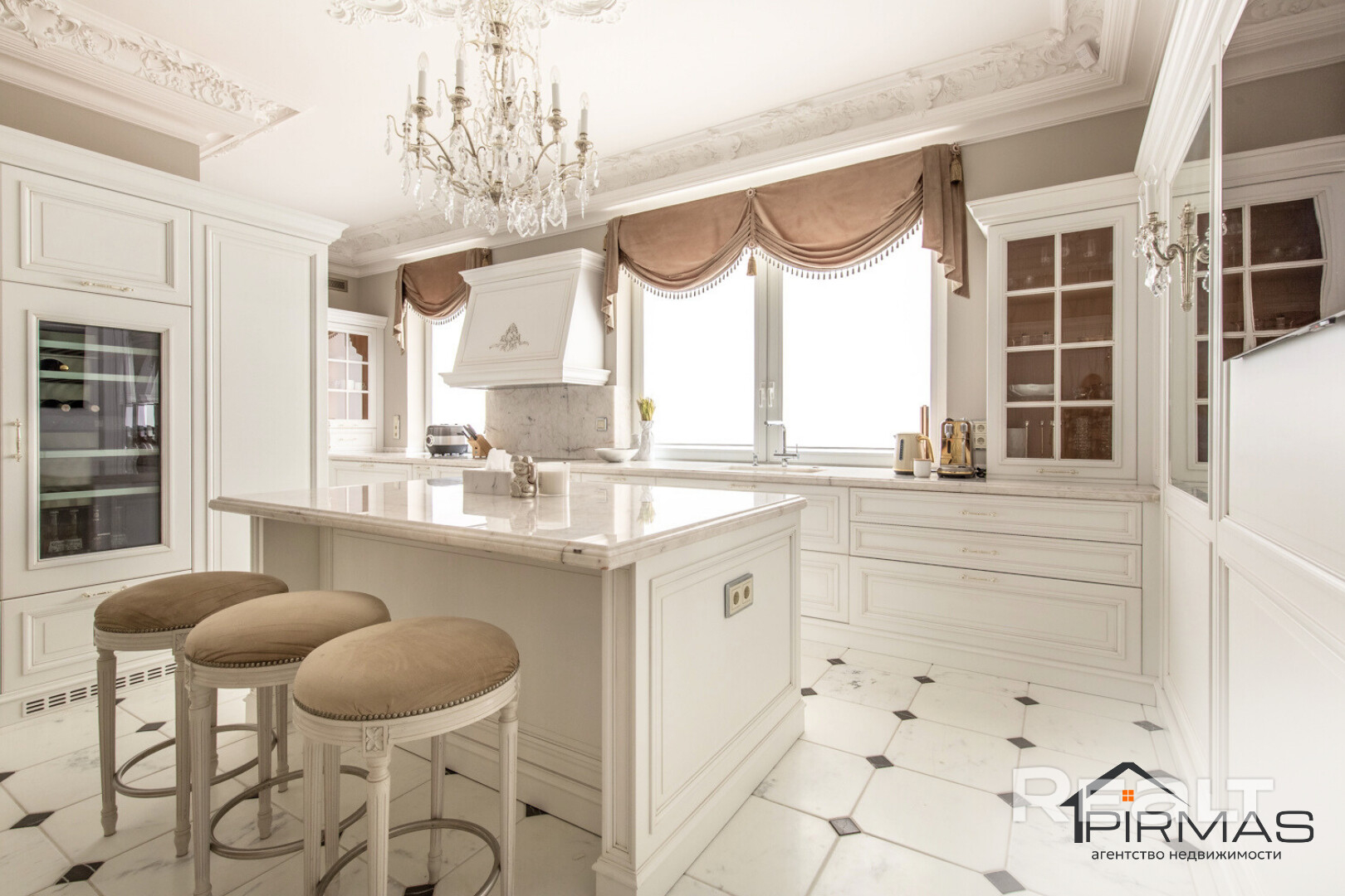 В квартире огромный холл, гостиная, объединённая со столовой зоной и собственным камином, отдельная кухня, основная спальня с гардеробной и ванной с окном, гостевая спальня с гардеробной, санузлом с душем, кабинет с библиотекой, постирочная с выдвижной кроватью для персонала, а еще — отдельные хозяйственные и технические помещения.