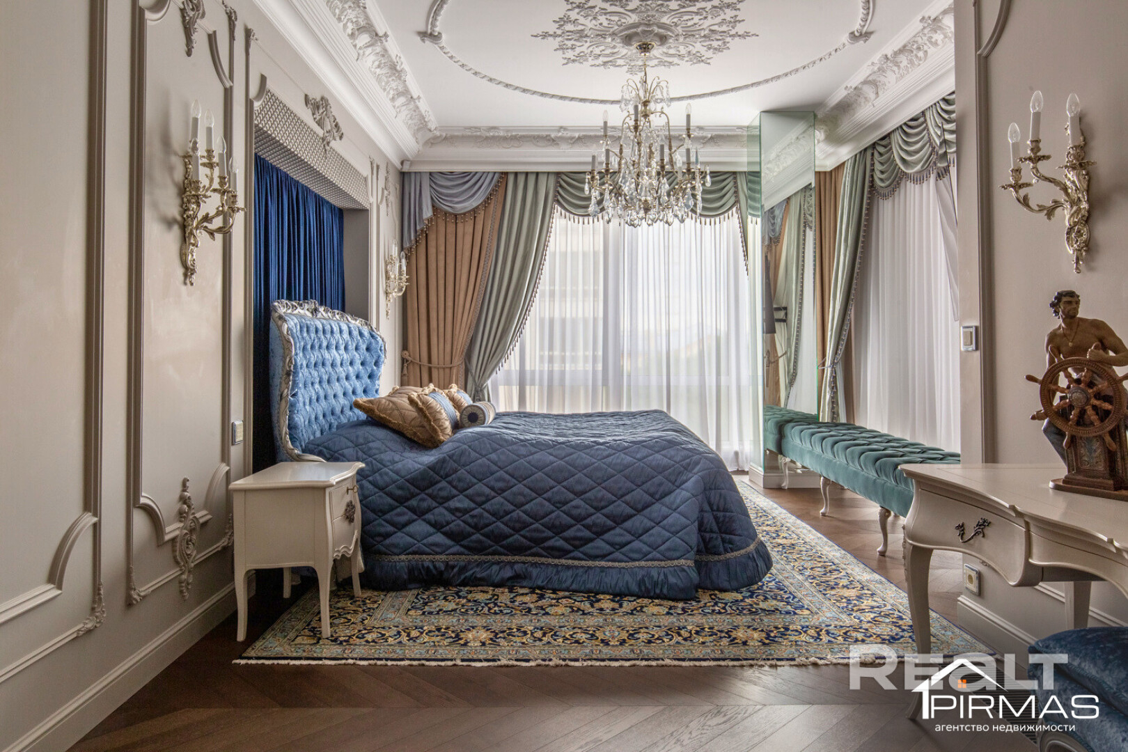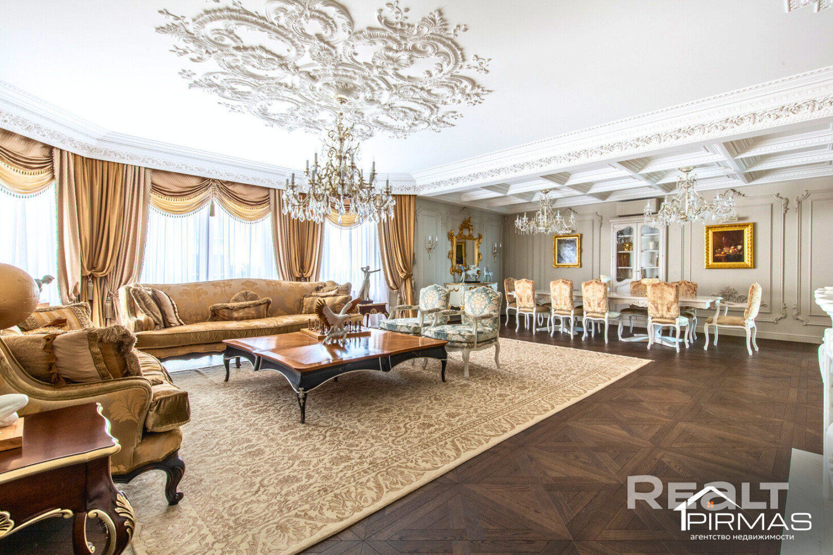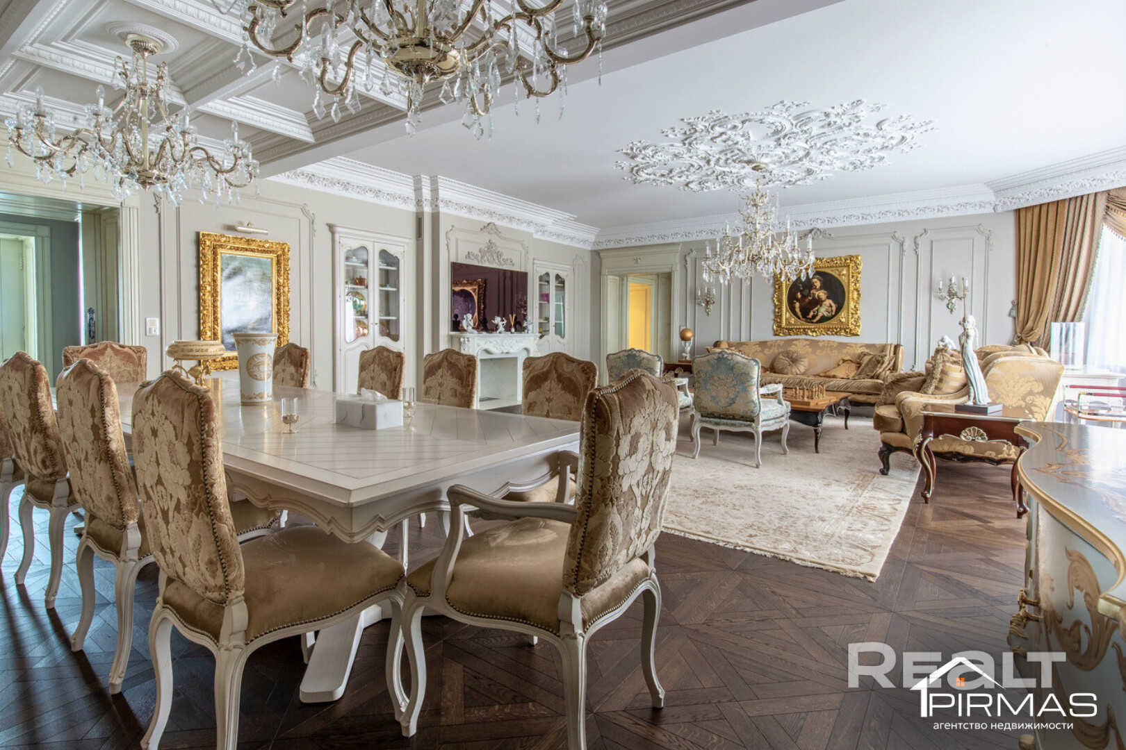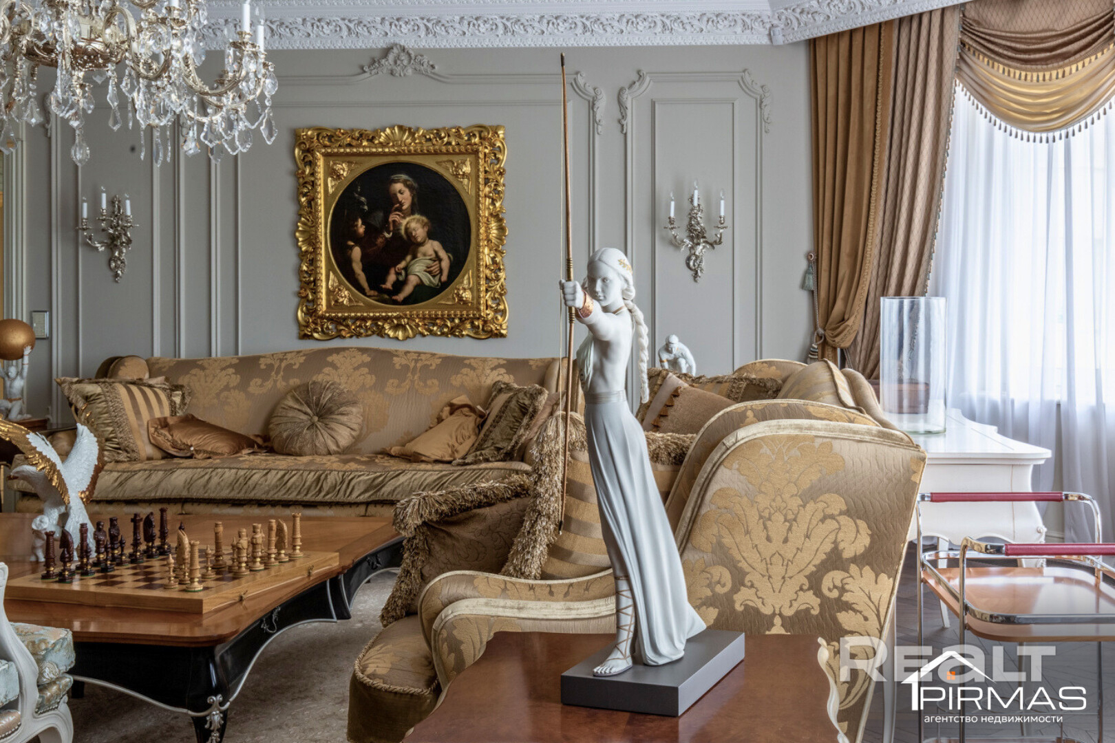 Комнат в квартире всего три, зато общая площадь — 282,7 квадрата, на которых буйным цветом расцвела, как указано в объявлении, европейская неоклассика с элементами ренессансной симметрии и барочной декоративности: оригинальные картины итальянских художников XIX века, коллекционные статуэтки, авторская лепнина, индийские ковры из шерсти и шелка ручной работы, мебель, люстры, зеркала.
