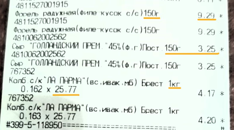 Что теперь? Колбаса «Ла Парма» подорожала больше всех. Правда, в 2022 году колбасу покупали в нарезанном виде массой 0,163 грамма. Обошлось такое количество в 4 рубля 20 копеек. В этот раз нарезанной «Ла Пармы» не было. В целом виде теперь кило такой колбаски — 32 рубля 99 копеек, то есть на 7 рублей 22 копейки дороже, чем три года назад.
