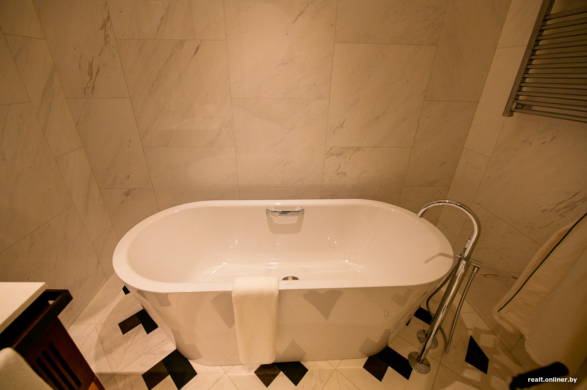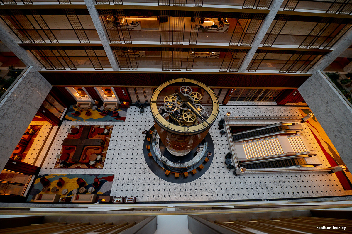Инсталляция с часами высотой 9,5 м в центре атриума лобби — одна из роскошных фишек отеля. Дизайн часов — из Англии, механизм — из Германии, основание — из Италии, декор — из Беларуси. Похожие часы есть в каждом Waldorf Astoria, но, говорят, минские самые высокие.