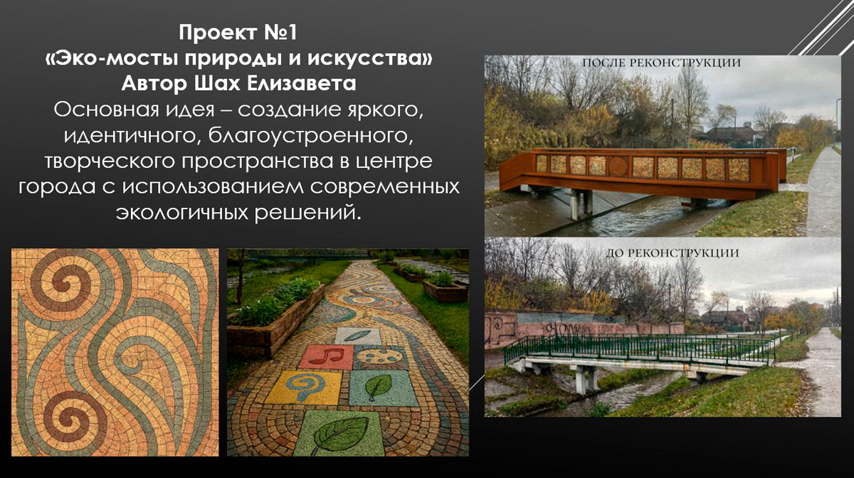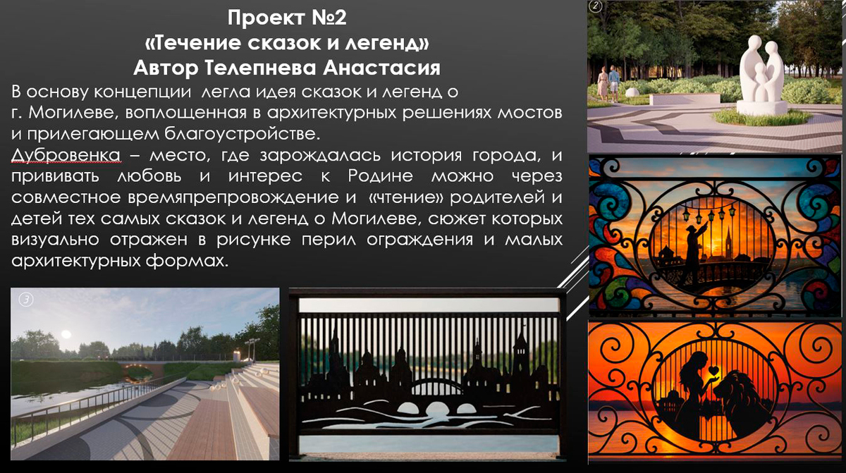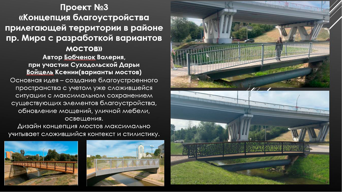 Со слов начальника управления архитектуры и градостроительства горисполкома Елены Гумен, в районе Дубровенки размещаются 11 пешеходных мостов. Они в неприглядном состоянии. Чтобы их отремонтировать, но не просто подновить, а превратить эти объекты инфраструктуры в современные произведения архитектурного искусства, было решено провести конкурс.