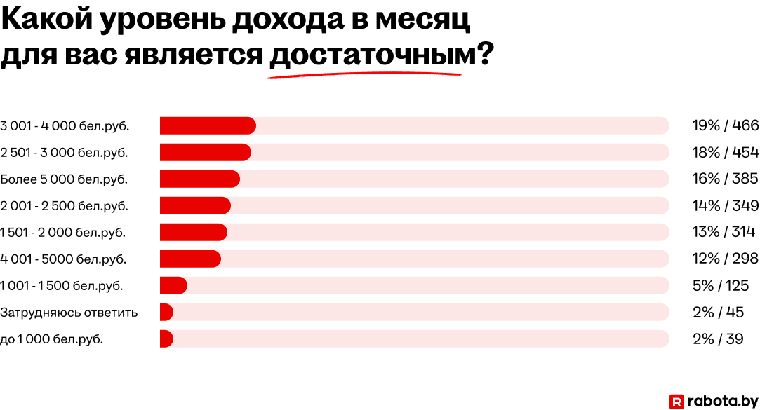Доход до 1,5 тысяч белорусских рублей считают для себя приемлемым всего 7% опрошенных. Еще 13% вполне устроил бы доход от 1501 до 2000 рублей. Зато 78% ответили, что месячный доход быть никак не меньше 2 тысяч рублей в месяц.