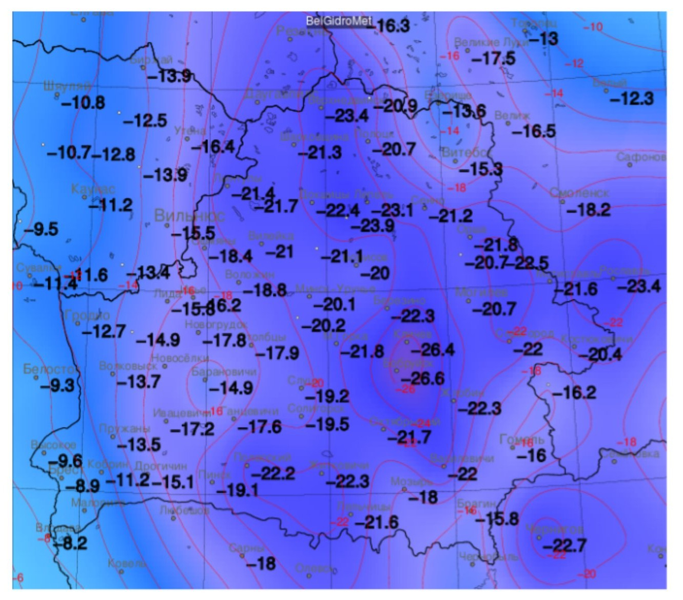 Если не считать бобруйско-кличевскую аномалию, где всегда концентрируется холод (было ночью до -26,6°), у всех остальных ночь прошла более-менее терпимо.