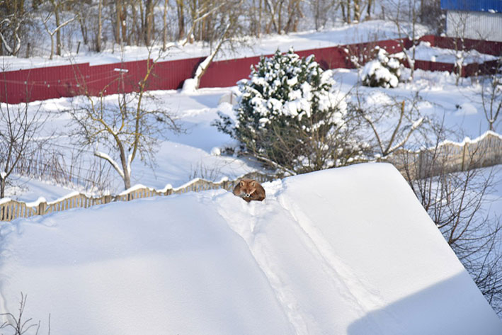 Фото «рыжей бестии», обосновавшейся для отдыха на коньке крыши хозпостройки частного дома в Глубоком (Витебскся область), опубликовало местное издание «Веснік Глыбоччыны».